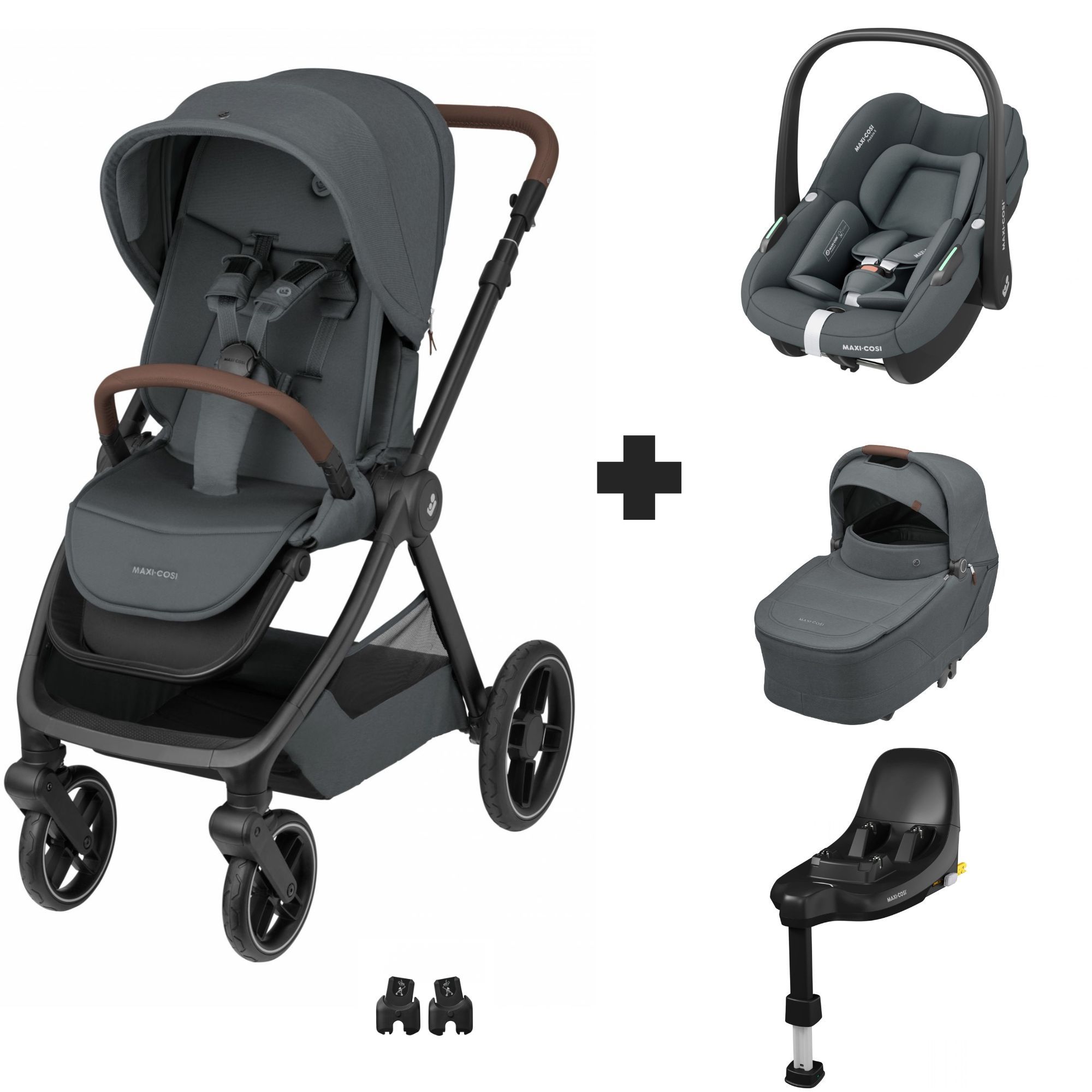 Inclus : Adaptateurs nacelle, arceau de maintien, canopy extensible UVP50+, panier shopping et réducteur