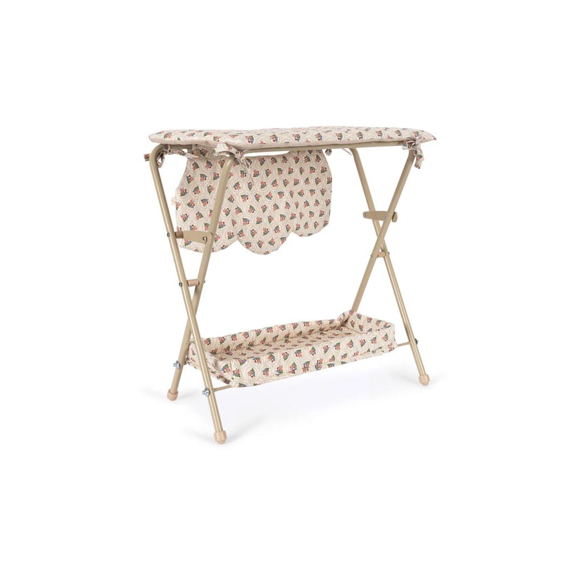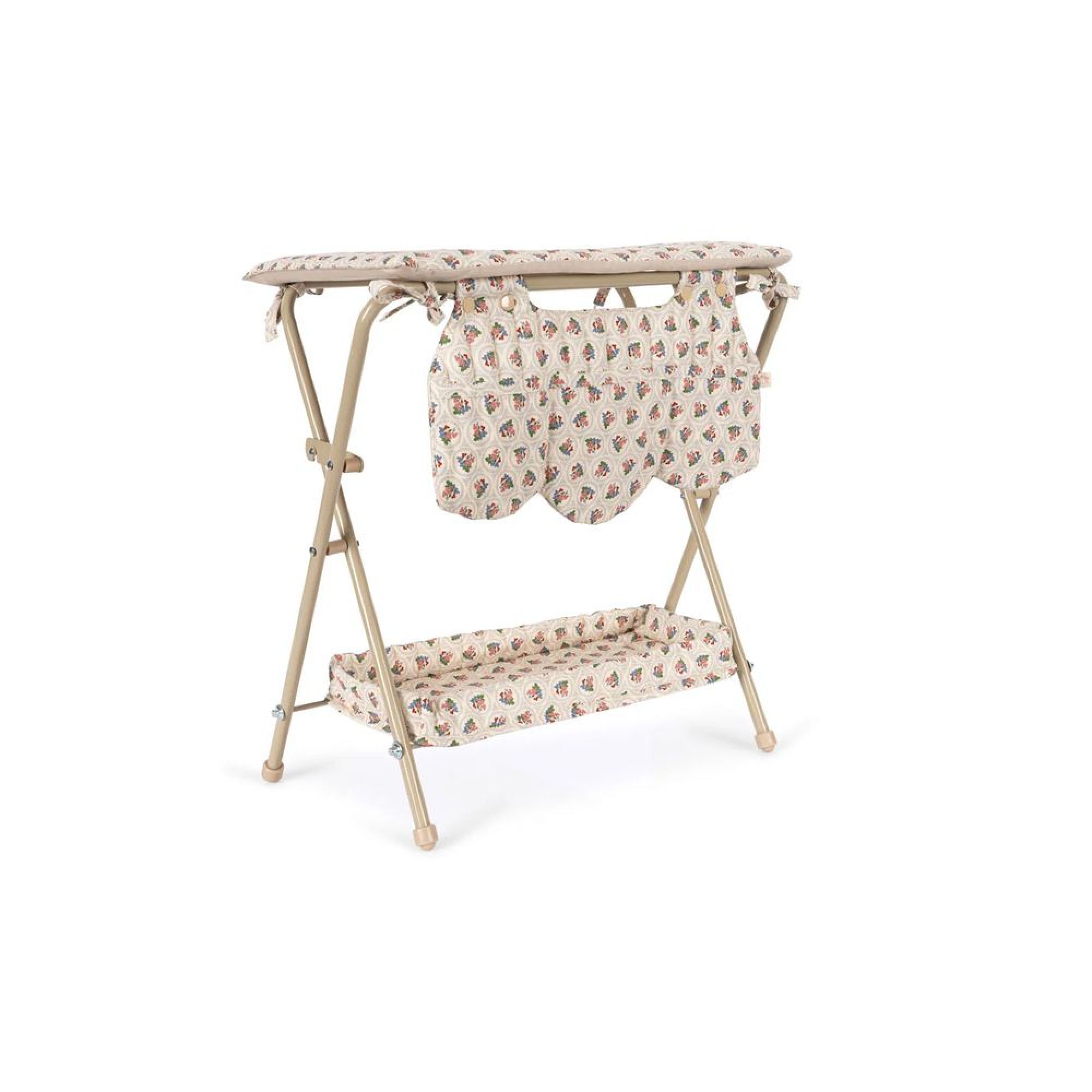 Choissez cette table à langer Verona de la marque Konges Slojd . Idéal en complément des poupées de la marque, votre enfant s'occupera de son poupon comme les grands . Table à langer pour poupée avec structure en métal robuste et plateau rembourré. Grand espace de rangement pour les fournitures de votre poupée en dessous et dans les poches latérales. Ourlets festonnés. Facile à plier et à ranger.