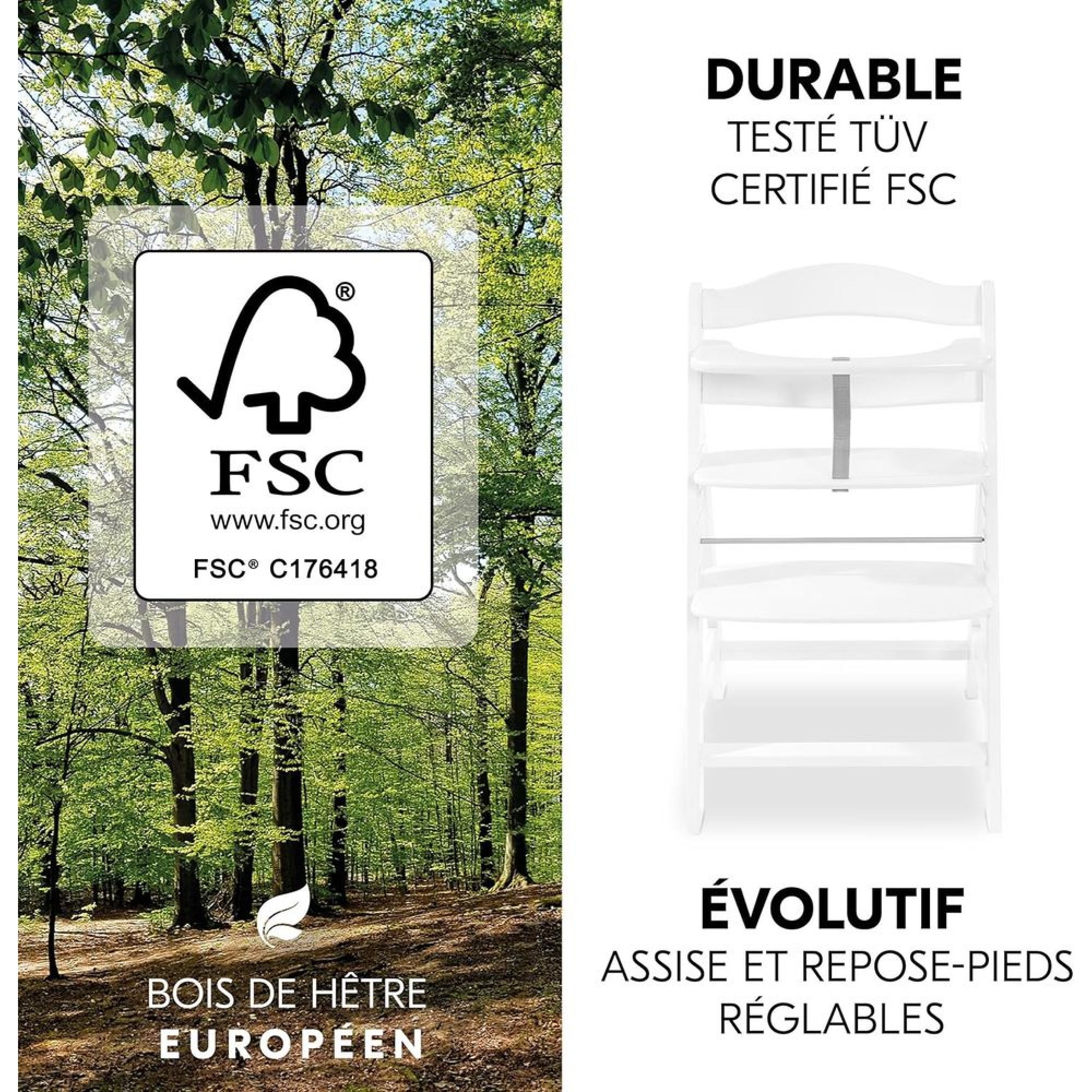 La chaise haute évolutive Alpha+ est la chaise idéale ! Elle peut supporter jusqu'à 90kg grâce à son bois de hêtre robuste. Grâce aux glissières de sol, votre enfant ne pourra pas basculer. Si votre enfant se pousse de table, la chaise va simplement se glisser vers l'arrière à la place de s'incliner. Ainsi, la sécurité de votre enfant est renforcée. L'assise et le repose-pied sont réglables facilement. Voici, une chaise sûre et durable pour les petits et les plus grands. L'ajout du coussin Deluxe dans ce pack permet à votre enfant d'être confortablement installé pour les moments de repas ou du jeu .