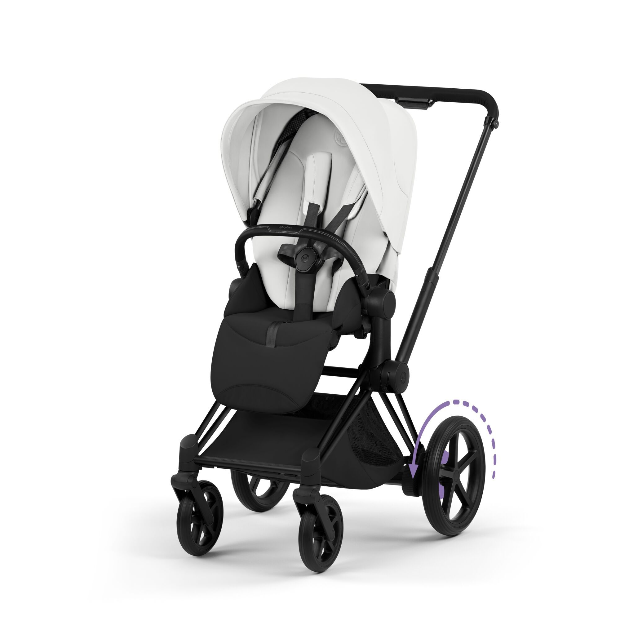 Inclus : Châssis e-Priam avec roues, assise (structure + textile), garde-corps, adaptateurs siège auto, panier shopping, habillage pluie, batterie et chargeur, guide utilisateur