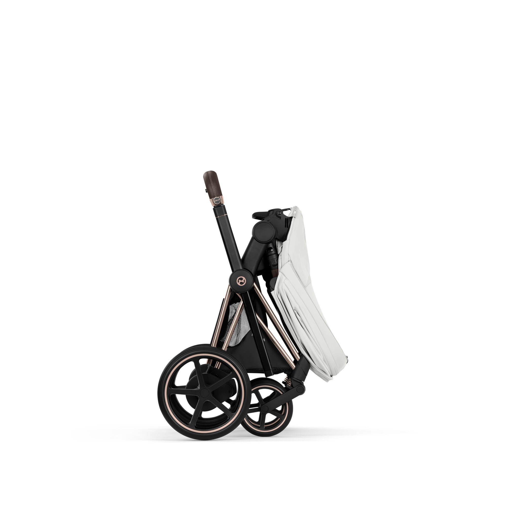 Inclus : Châssis e-Priam avec roues, assise (structure + textile), garde-corps, adaptateurs siège auto, panier shopping, habillage pluie, batterie et chargeur, guide utilisateur