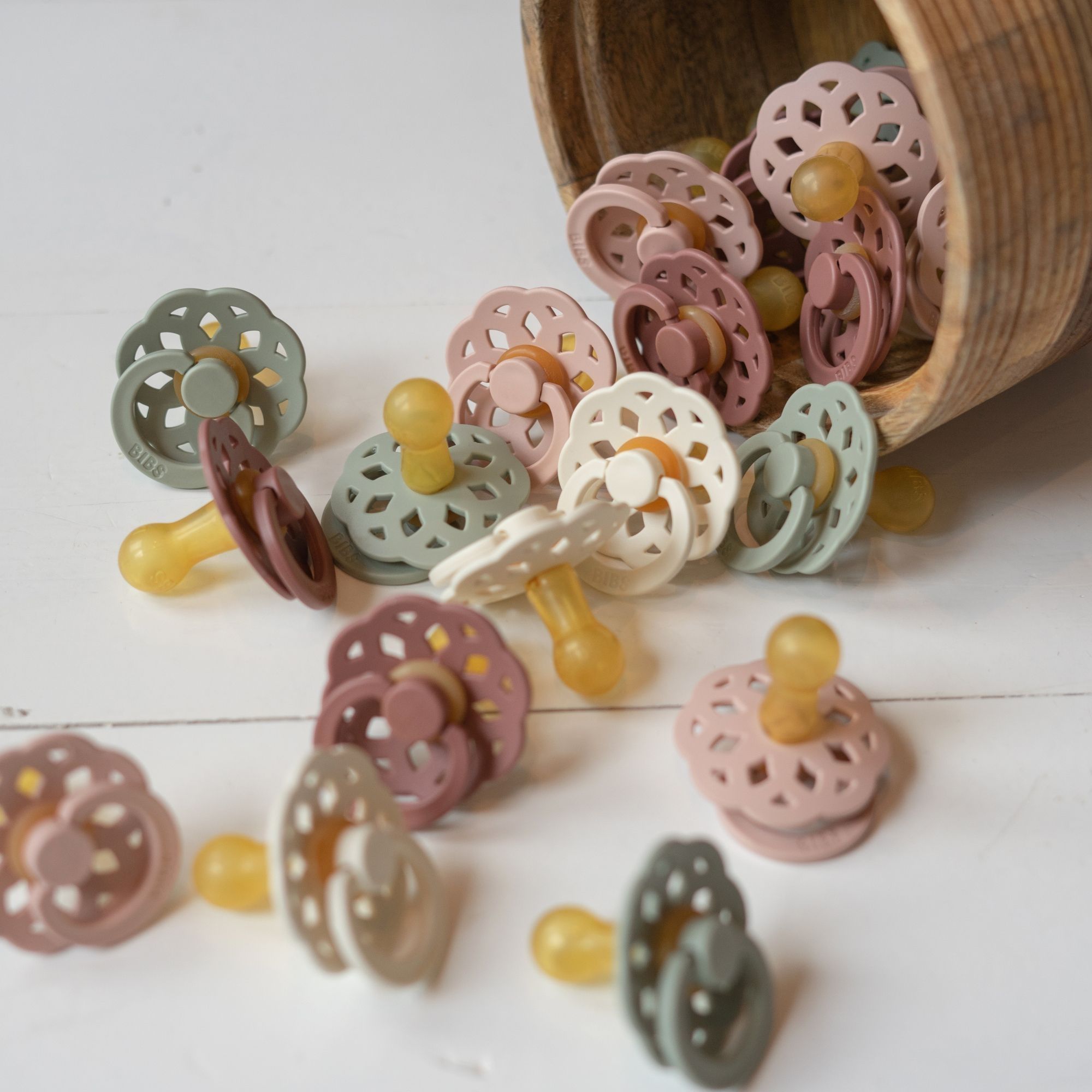 Choisissez ce joli lot de 2 sucettes en caoutchouc naturel de la collection Bohème de couleur Vanilla et Pine de la marque Bibs. Elles ont été spécialement conçues pour les bébés dès 6 mois. Ces sucettes Bibs au style bohème moderne possèdent une tétine ronde qui rappelle la forme et la taille du sein maternel. Cela incitera votre enfant à enrouler sa langue autour de la tétine et à téter de la même façon qu'il le ferait au sein. Ces sucettes Bibs sont compatibles avec les attaches sucettes de la même marque pour que votre bébé ne perde pas son objet préféré !