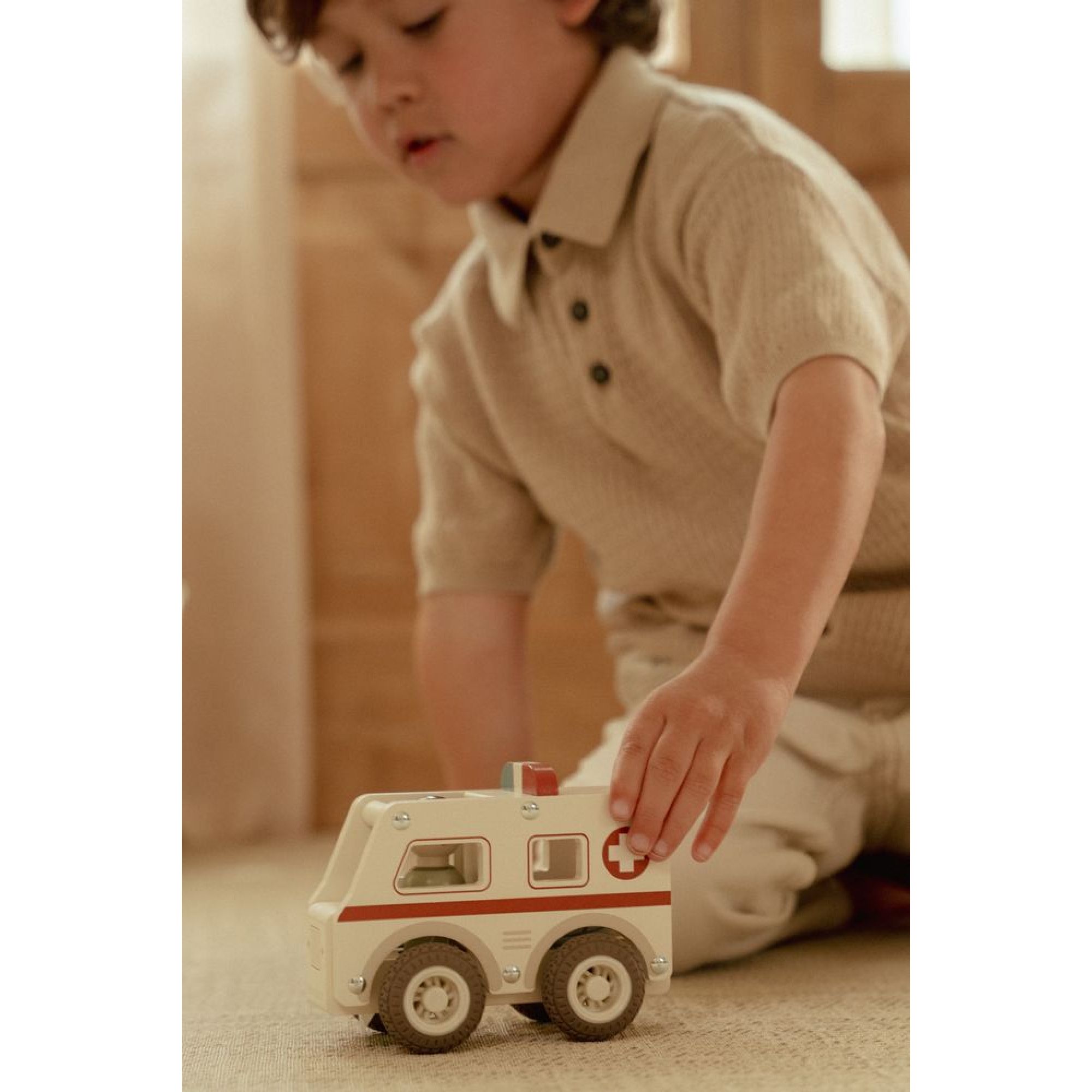 L'ambulance est fabriquée en bois certifié FSC (Forest Stewardship Council), garantissant que le matériau provient de forêts gérées de manière responsable. Elle est également peinte avec une peinture à base d'eau non toxique, assurant la sécurité des tout-petits.