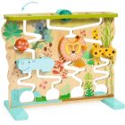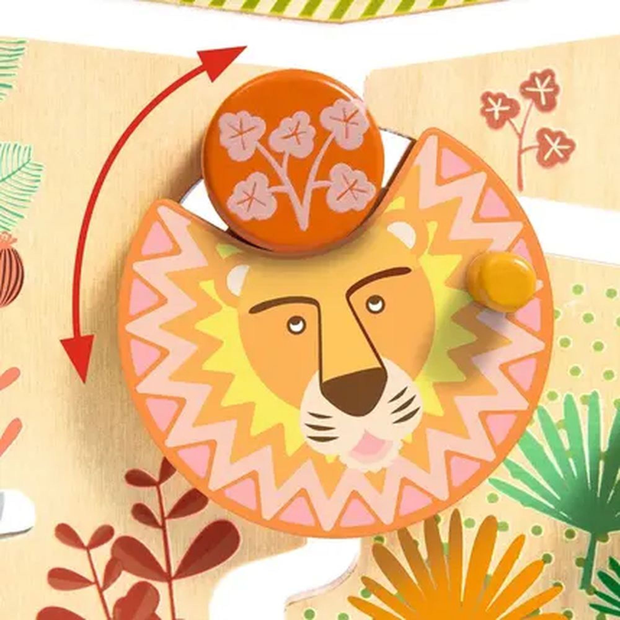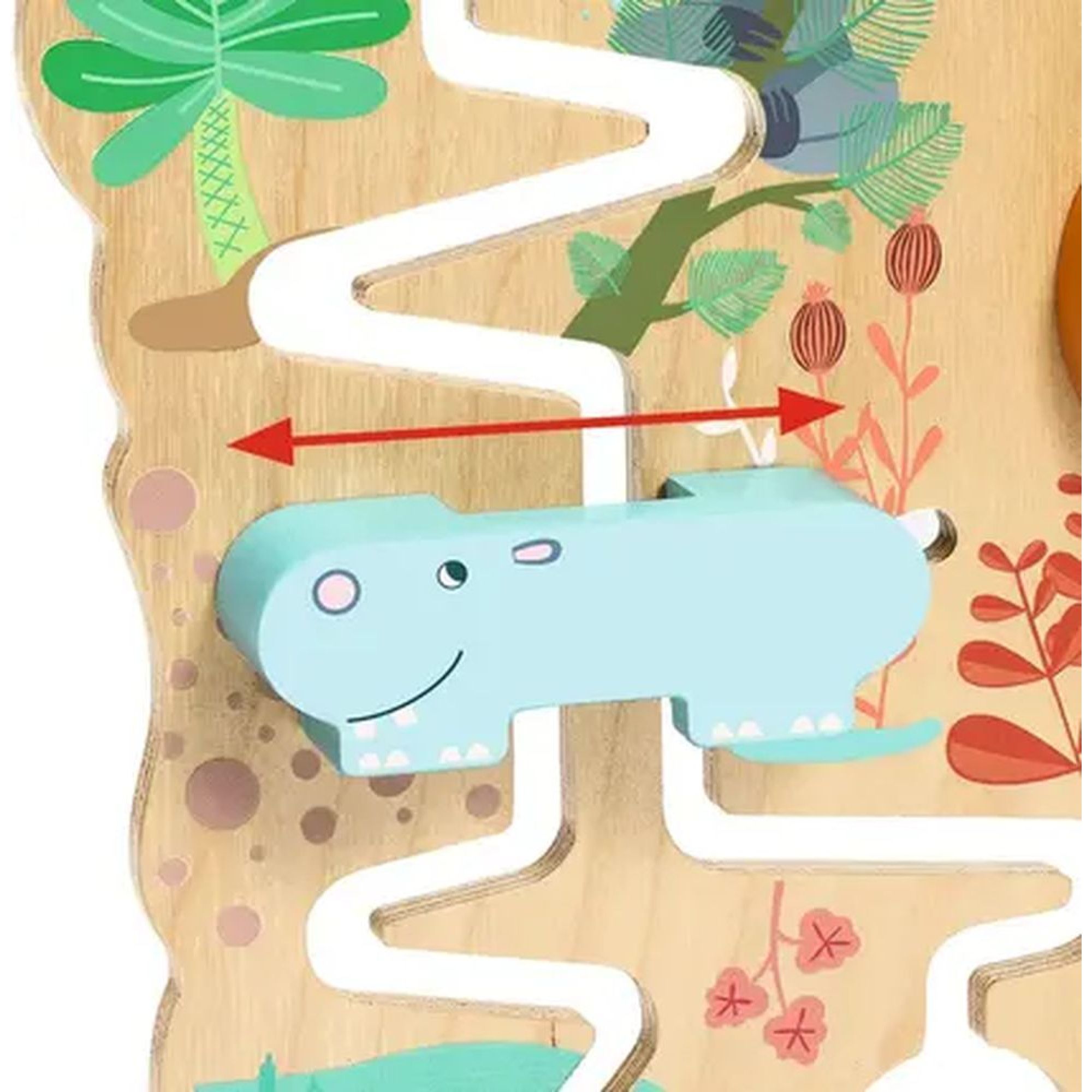 Pour faire descendre les palets, votre enfant recontrera des obstacles sur le parcours : un lion à tourner, une girafe à tirer et un hippopotame à décaler. Les palets se déplacent lentement pour laisser le temps à votre enfant d'observer la descente et comprendre le chemin.