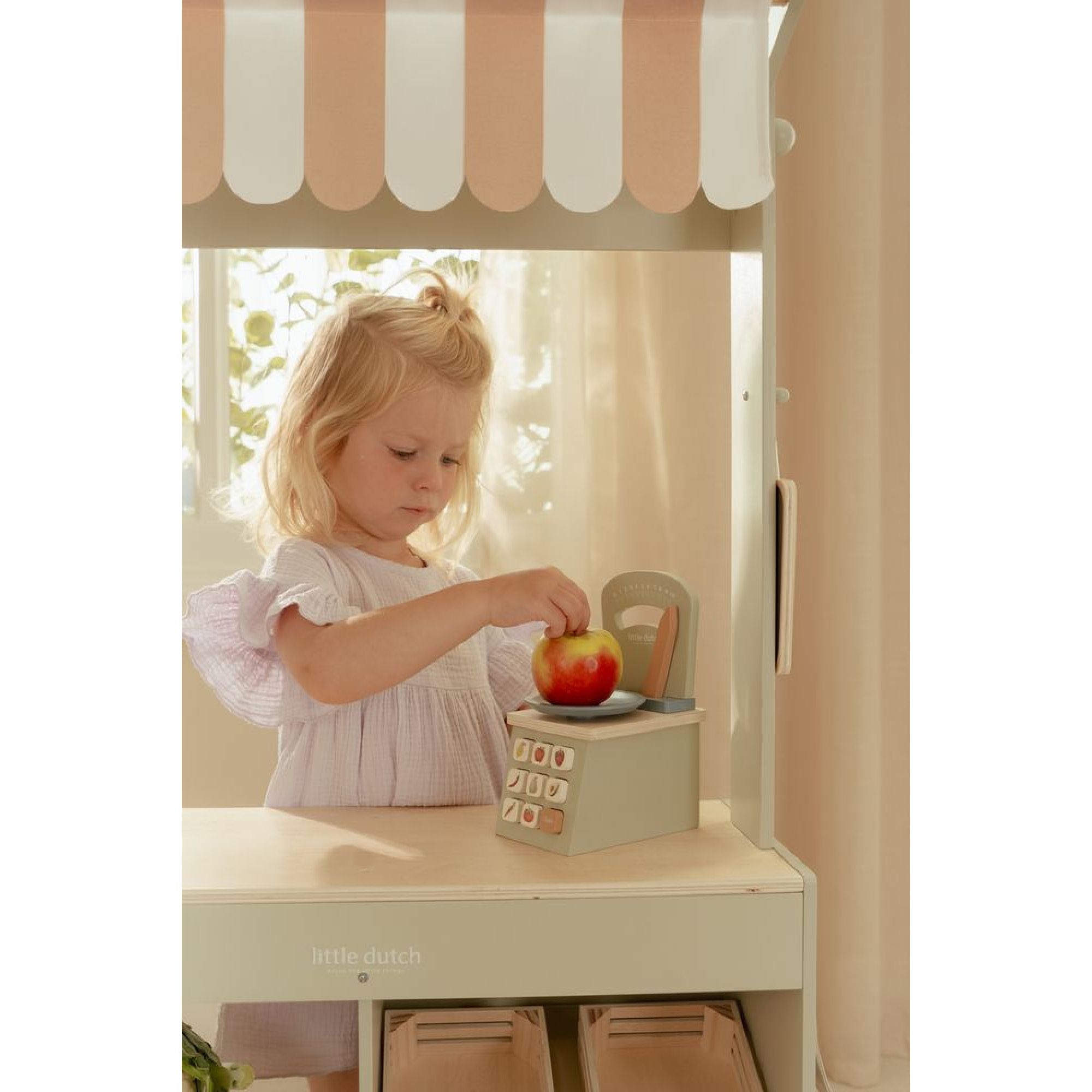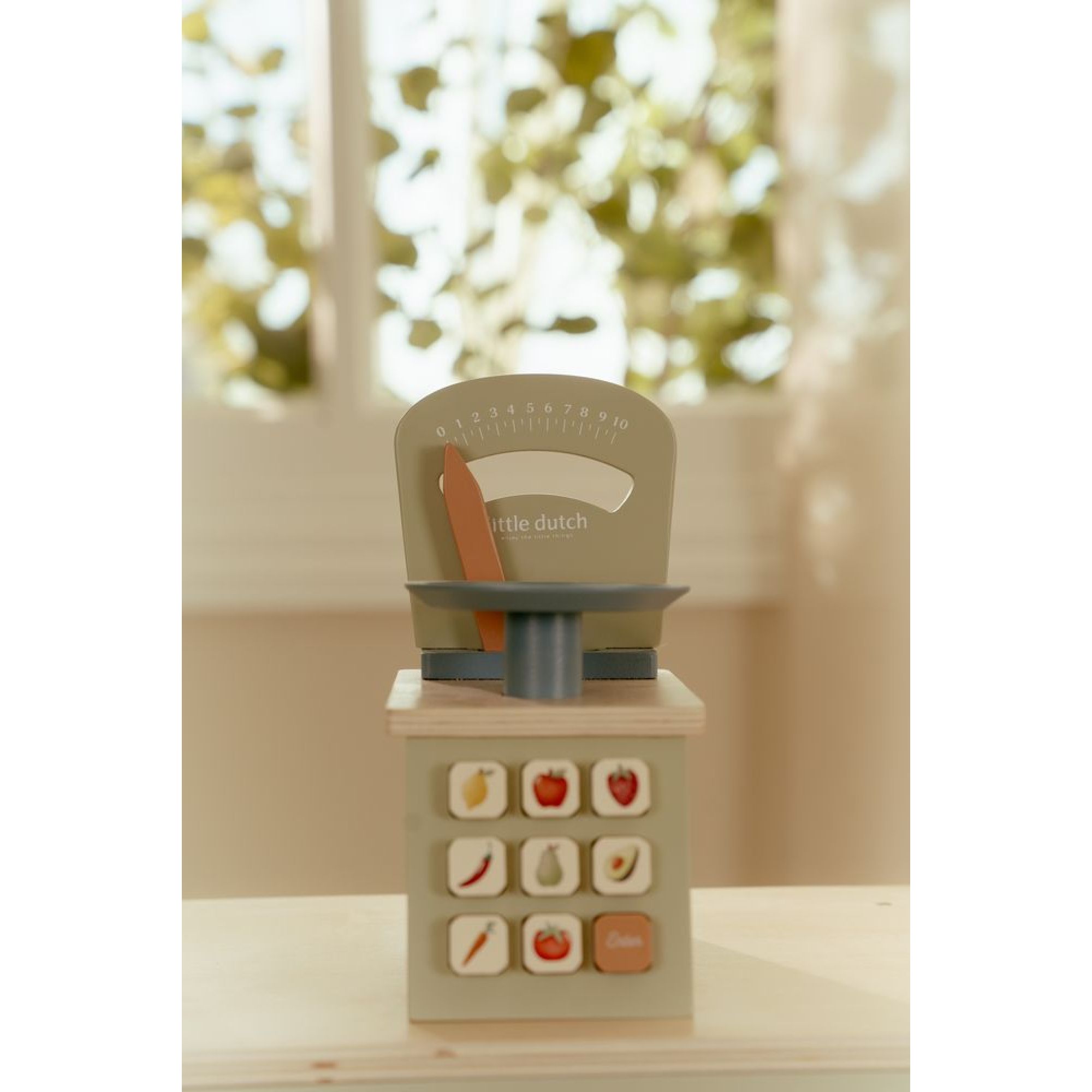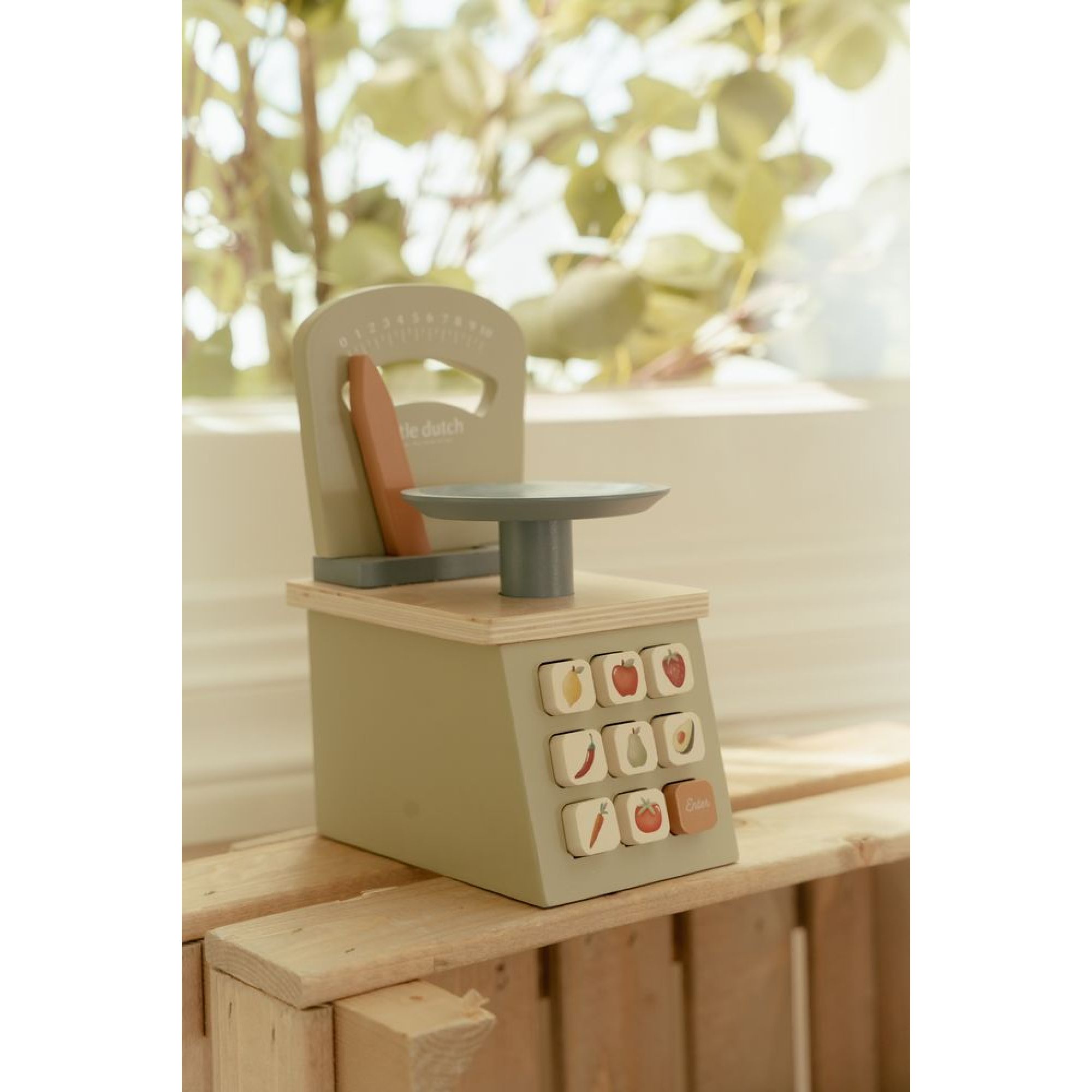 Découvrez la balance en bois de la marque Little Dutch. Ce jouet d'imitation est parfait pour accompagner les jeux de dînette ou les étals de marché. Elle est conçue pour ressembler à une balance de cuisine. Elle comprend un plateau et une aiguille mobile qui s'anime lorsque le poids est placé, ajoutant au réalisme du jeu. Elle permet aux enfants d'imiter les adultes et de jouer à la marchande ou au cuisinier. Ils peuvent « peser » leurs fruits, légumes, ou autres aliments factices.