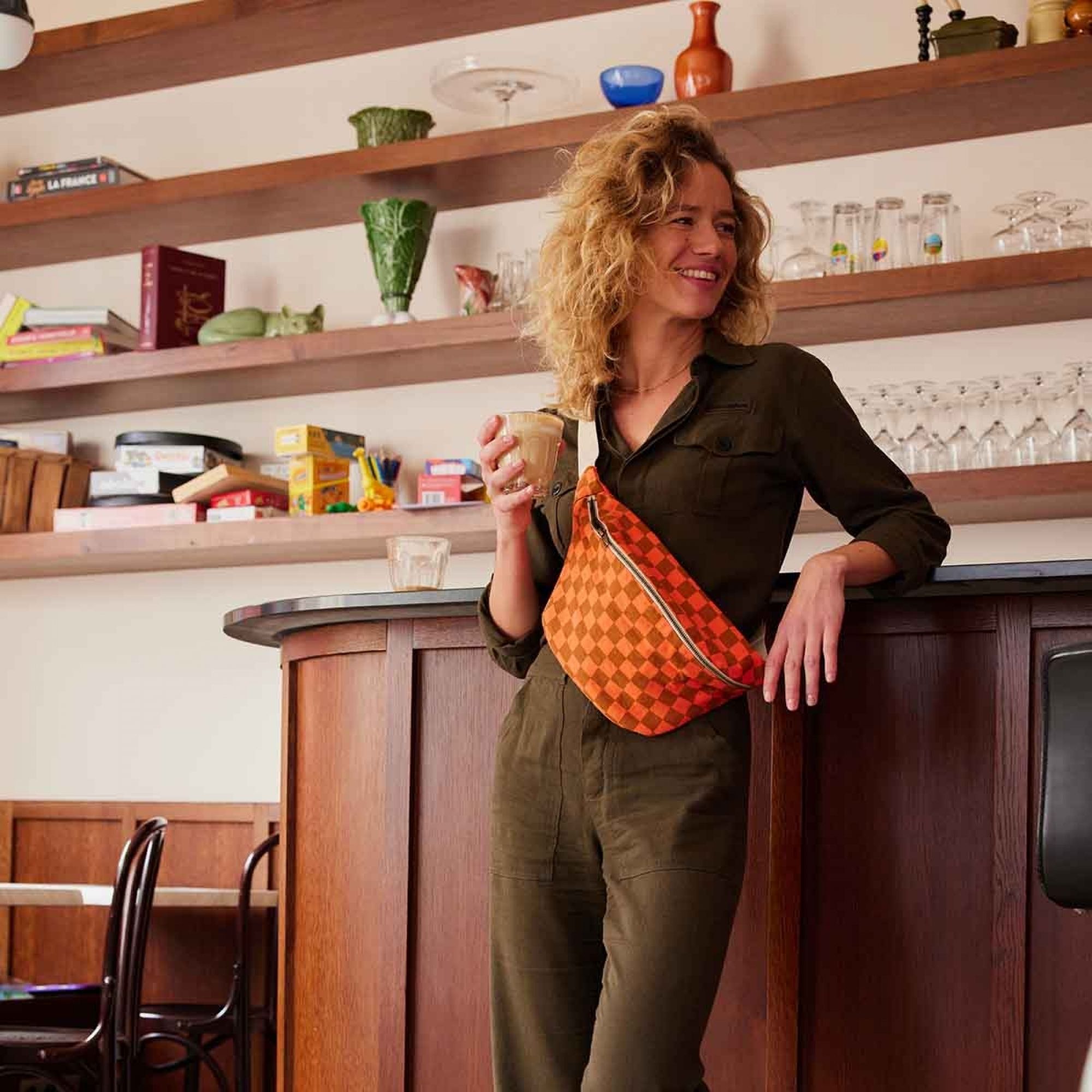 Craquez pour le sac banane Damier Corail et Caramel de la marque Rose in April. Cette banane deviendra votre indispensable pour transporter tous vos essentiels, sans être encombré par un sac à main !