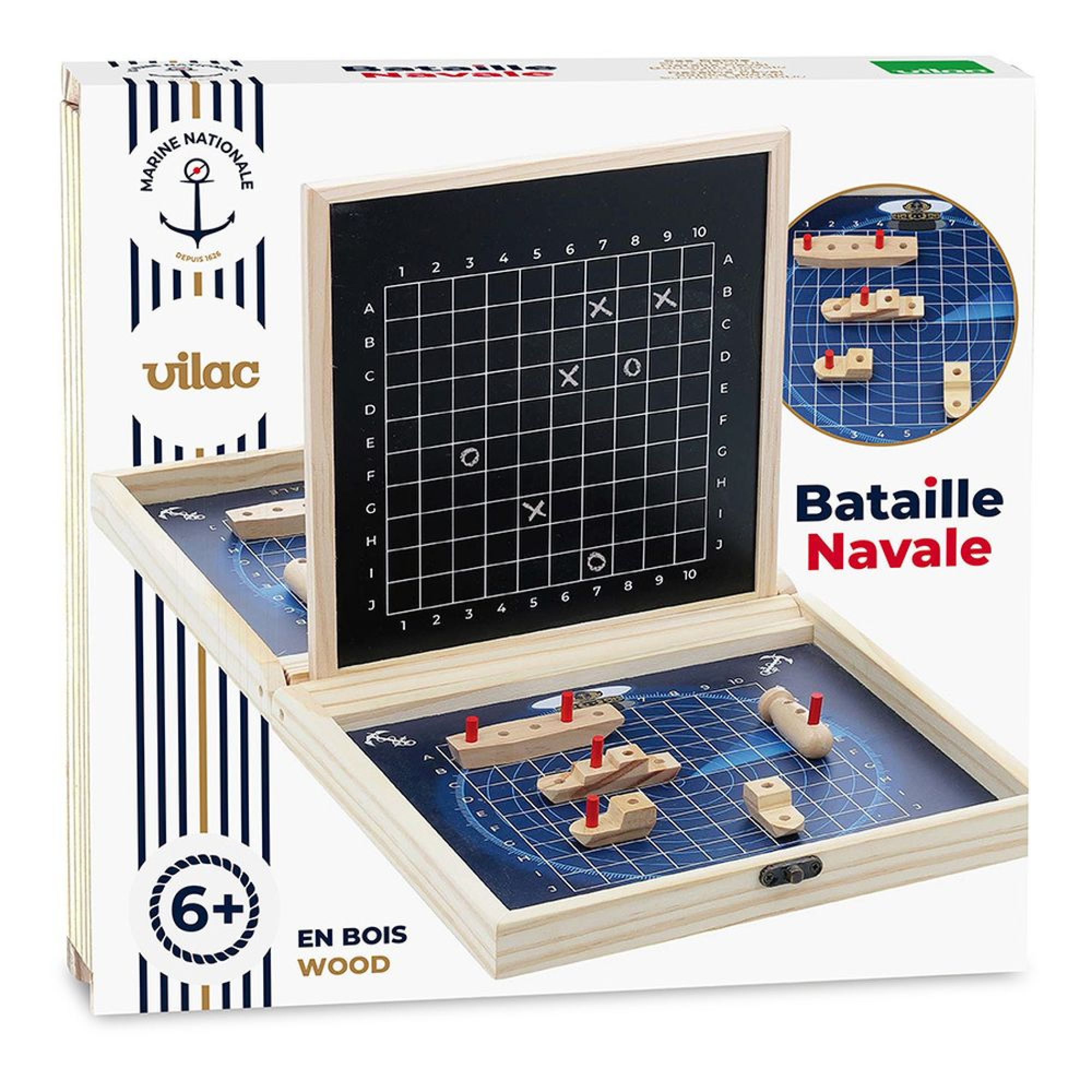 Laissez vous tenter par le jeu de bataille navale Marine nationale de la marque Vilac. Les joueurs devront placer comme il le souhaite les 5 bateaux sur leur partie et ensuite chachun leur tour indiqué une case pour faire couler les bateaux adverses.
