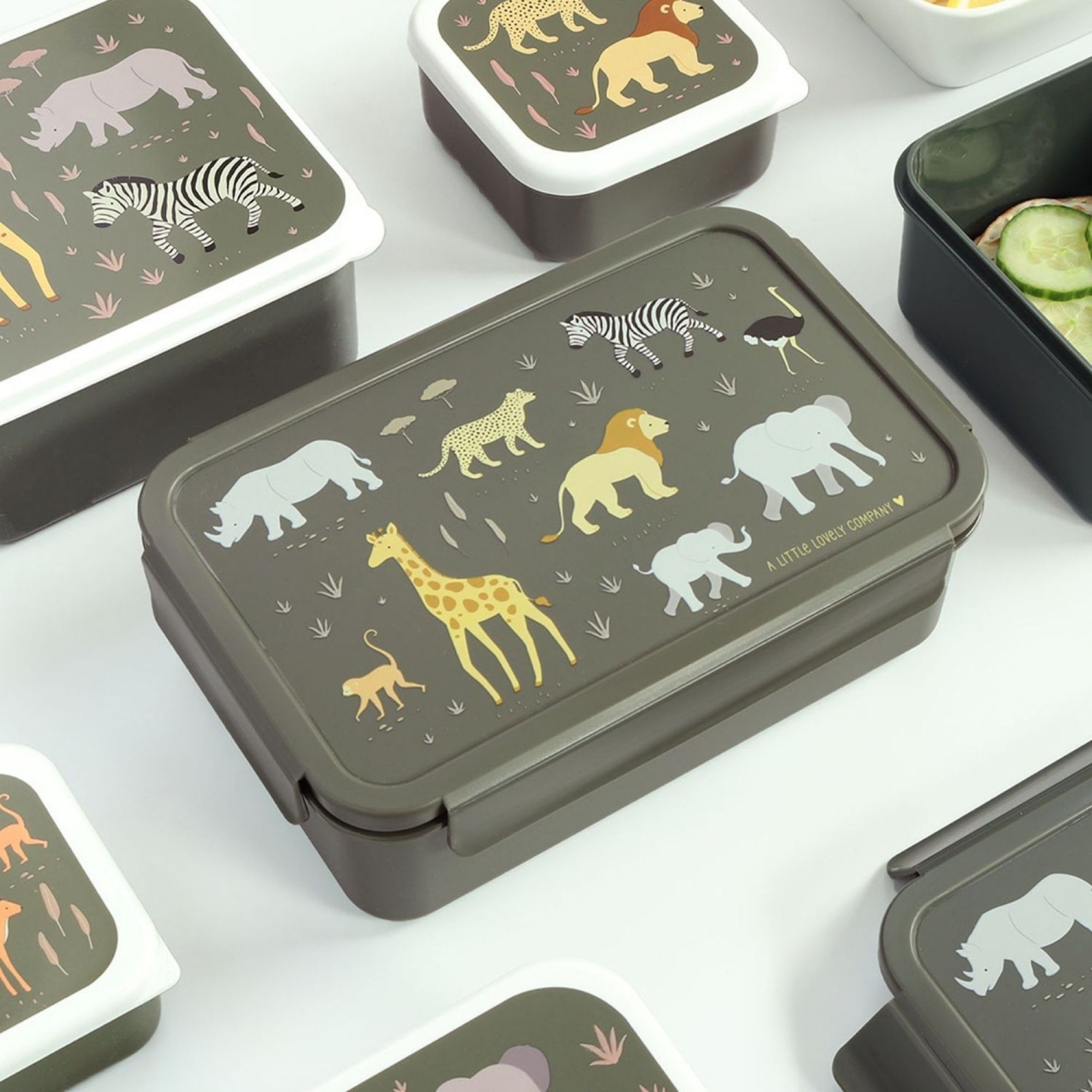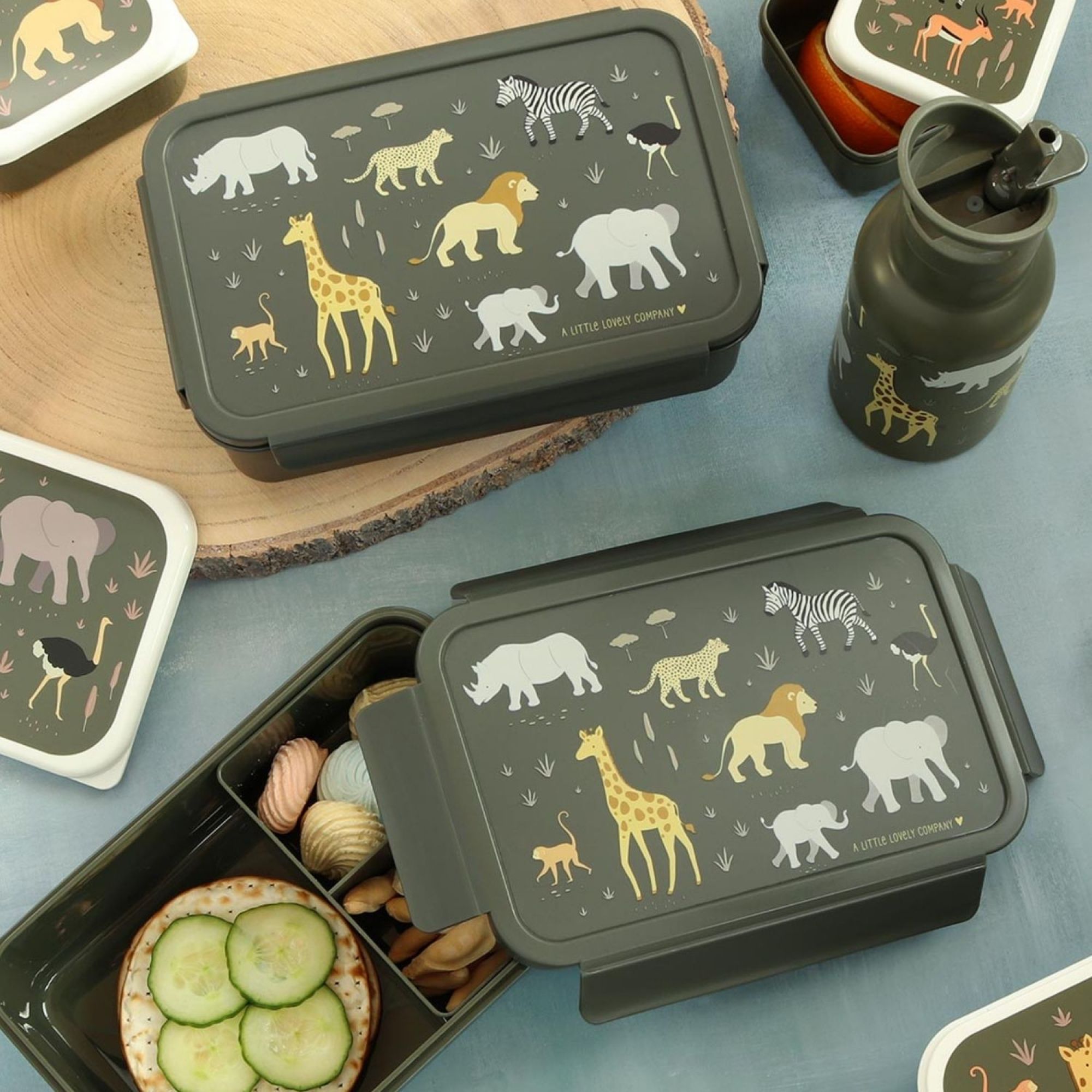 Craquez pour la lunch box Savane de la marque A Little Lovely Company ! Elle est pratique avec ses différents compartiments amovibles, et elle transportera le goûter et le déjeuner en toute sécurité avec son couvercle clipsable et le joint en silicone. Elle trouvera parfaitement sa place dans le sac à dos de votre enfant pour l'accompagner à l'école ou lors de ses sorties scolaires. Elle est disponible en plusieurs modèles.