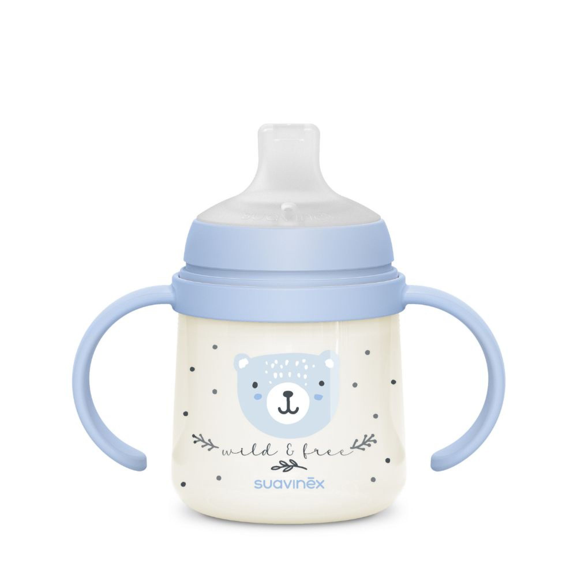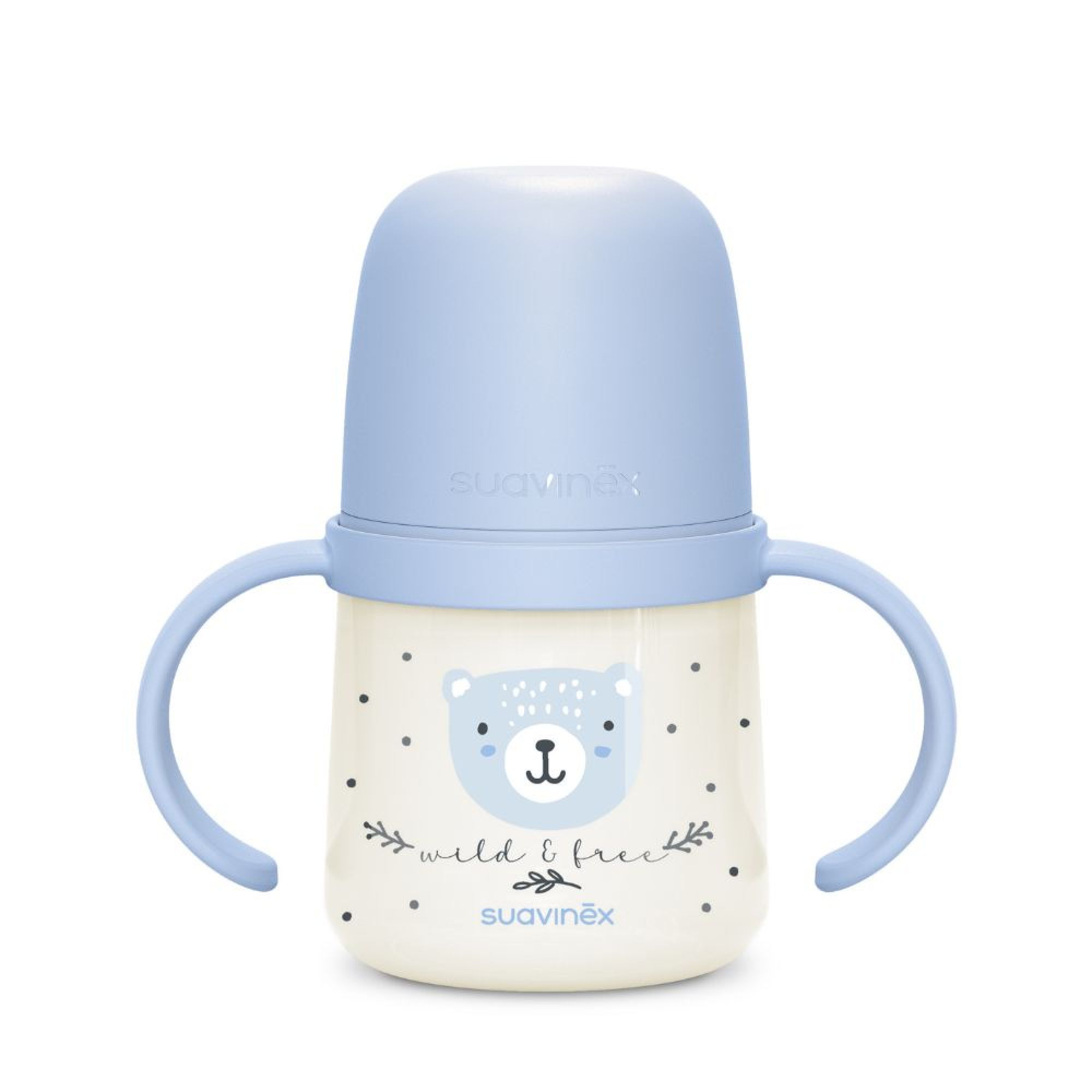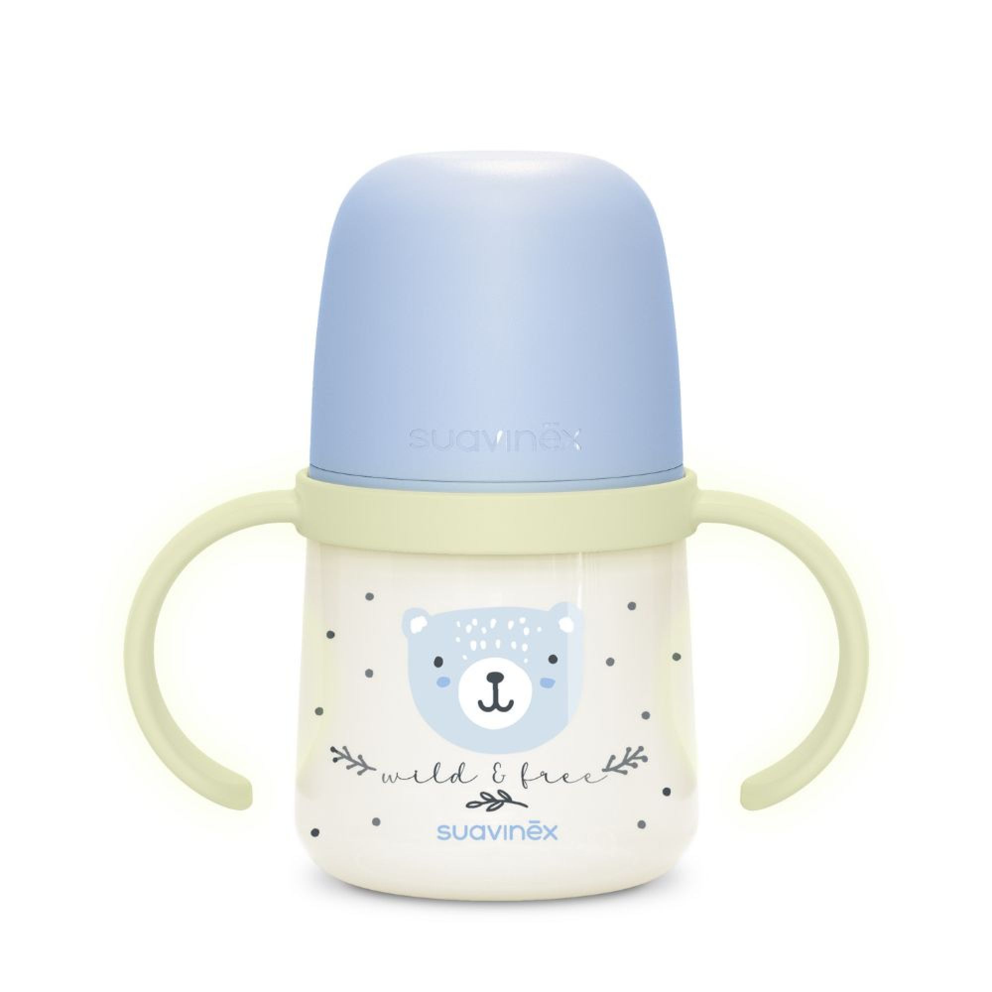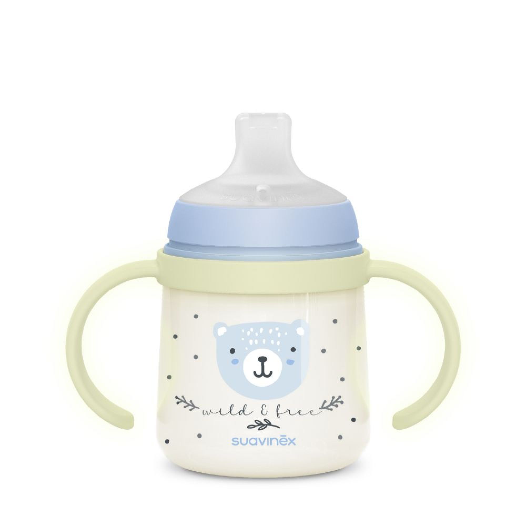 Aidez bébé à gagner en autonomie avec le biberon à anses Wild&Free 150 ml de la marque Suavinex. Conçu pour la transition entre le biberon et la tasse d’apprentissage, il possède un bec en silicone granuleux ultradoux aux bords arrondis, aussi agréable qu’une tétine SX Pro. Ses poignées ergonomiques, dont une paire qui brille dans le noir, permettent une prise en main facile même la nuit. Grâce à son bec anti-fuites, bébé boit en toute sécurité sans renverser. Sans BPA et compact, ce biberon est idéal dès 6 mois pour les repas à la maison comme en déplacement.