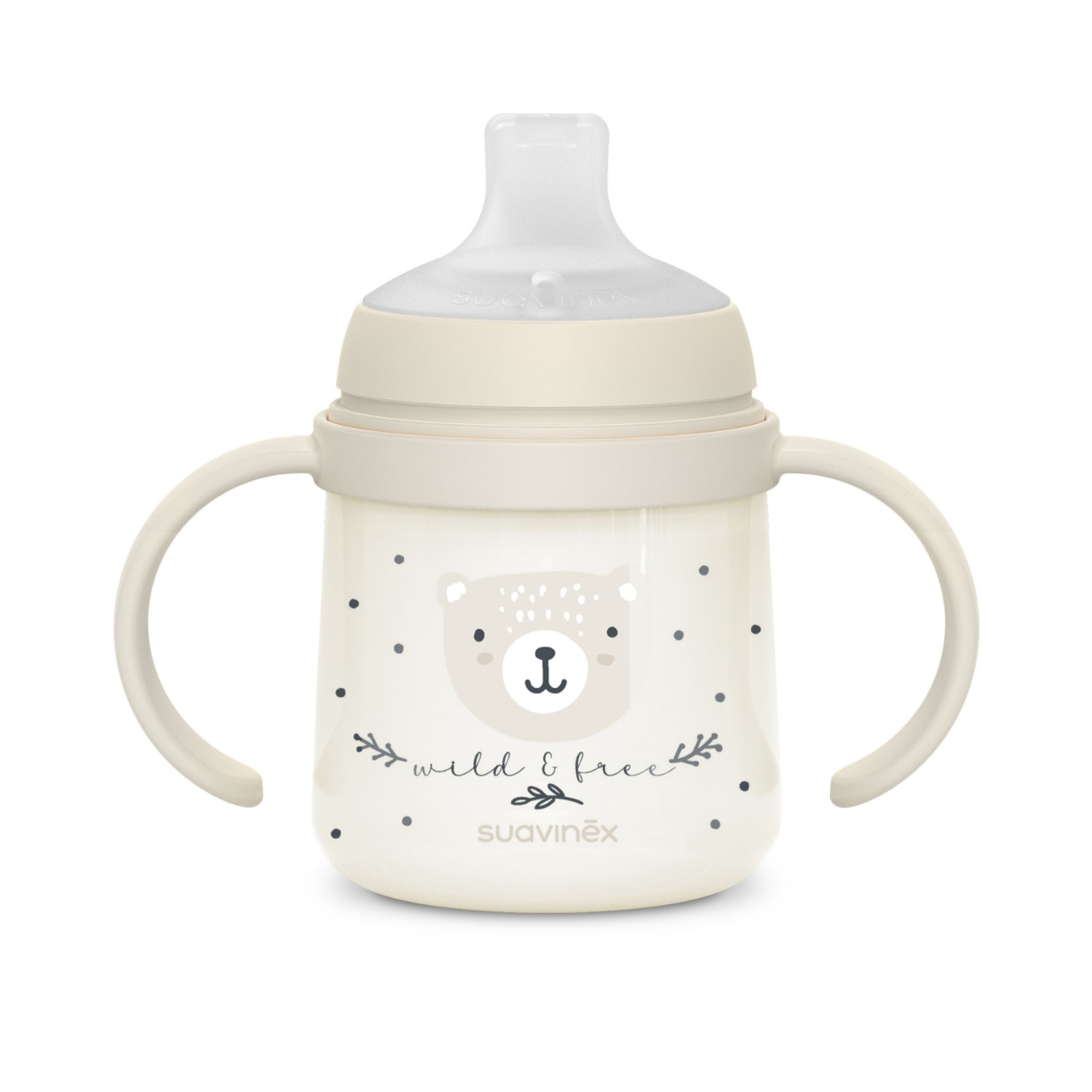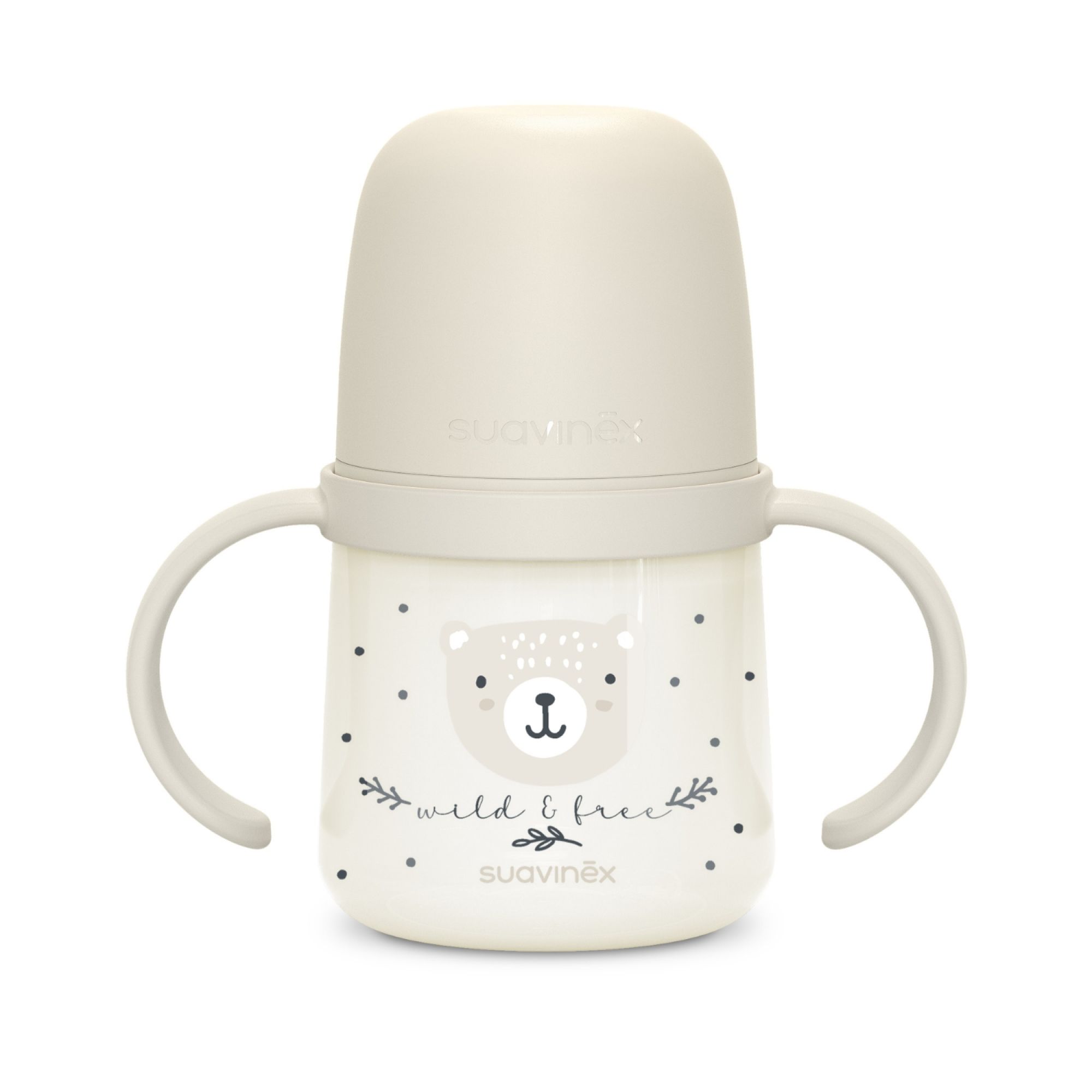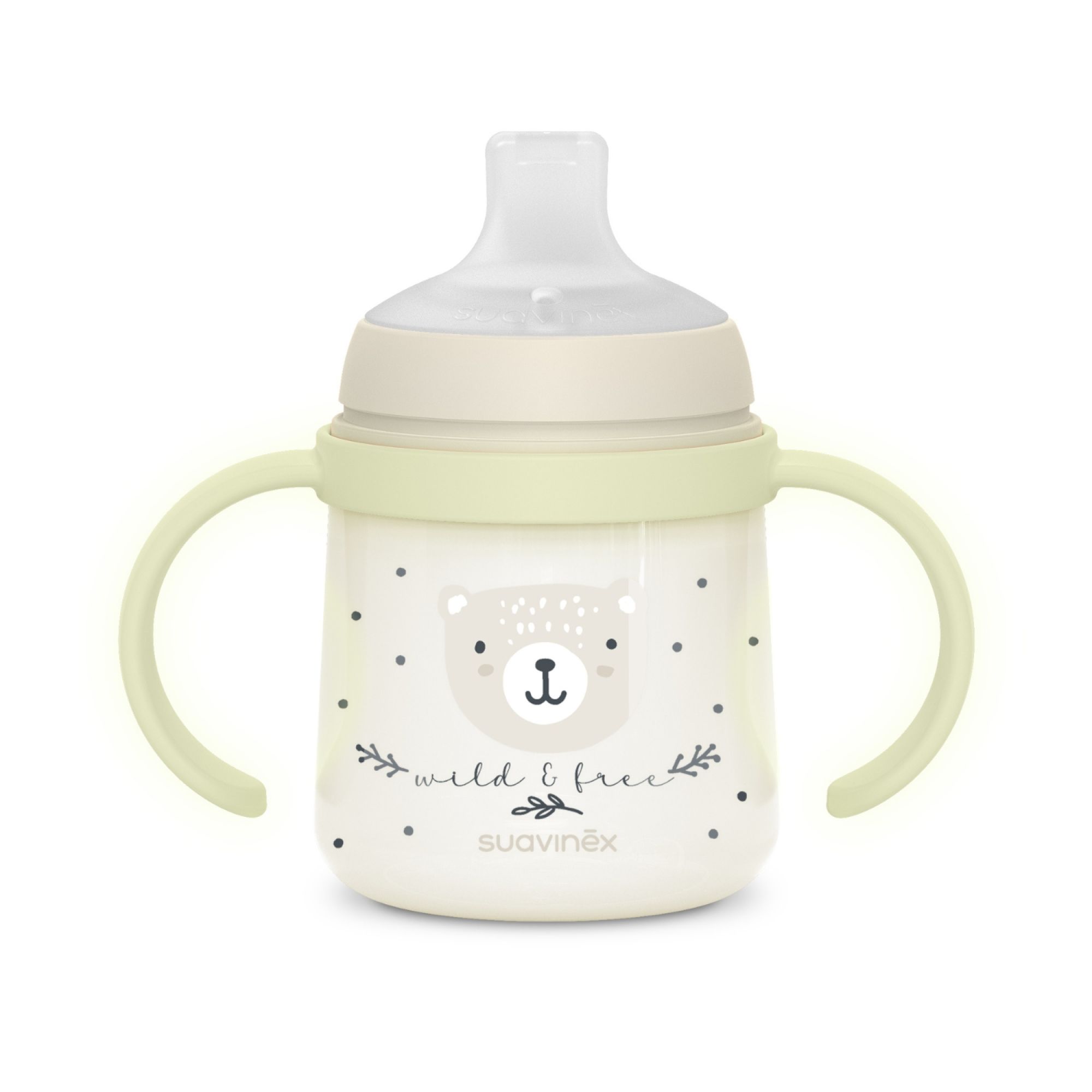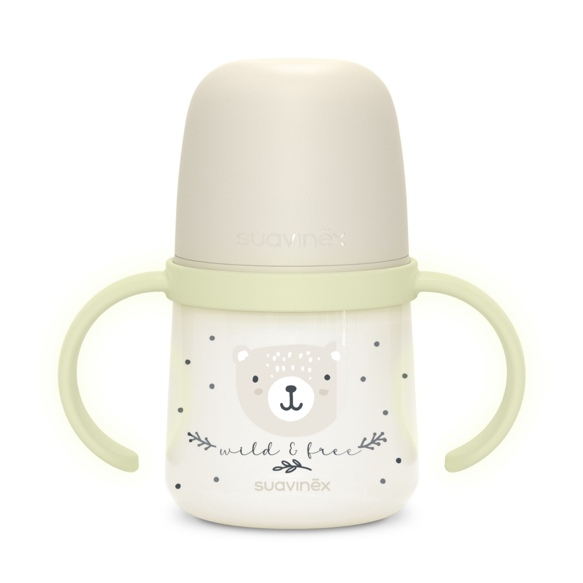 Aidez bébé à gagner en autonomie avec le biberon à anses Wild&Free 150 ml de la marque Suavinex. Conçu pour la transition entre le biberon et la tasse d’apprentissage, il possède un bec en silicone granuleux ultradoux aux bords arrondis, aussi agréable qu’une tétine SX Pro. Ses poignées ergonomiques, dont une paire qui brille dans le noir, permettent une prise en main facile même la nuit. Grâce à son bec anti-fuites, bébé boit en toute sécurité sans renverser. Sans BPA et compact, ce biberon est idéal dès 6 mois pour les repas à la maison comme en déplacement.