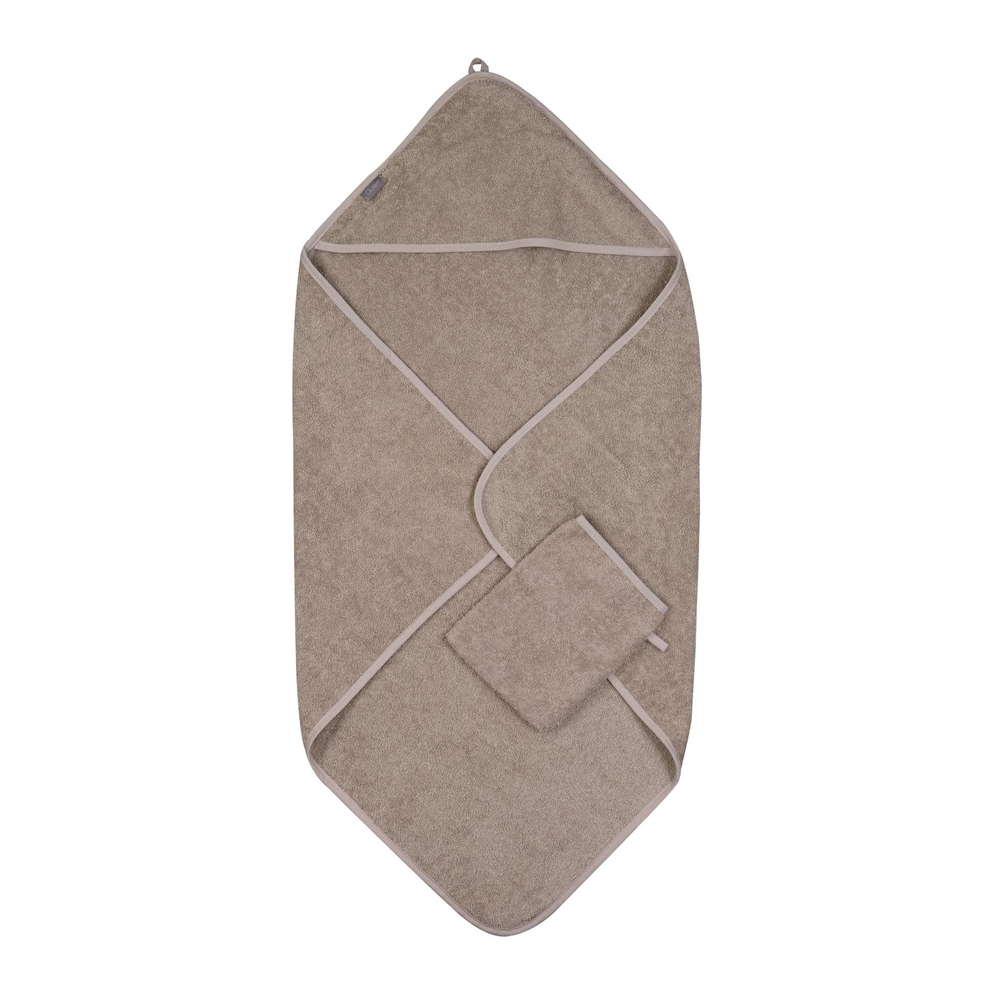 Adoptez la Cape de bain avec gant de toilette - Stone de la marque Quax. Idéale pour envelopper votre bébé avec douceur après le bain. Fabriquée en 100% coton, cette serviette à capuche allie élégance et praticité pour accompagner tous vos moments de soin avec bébé.