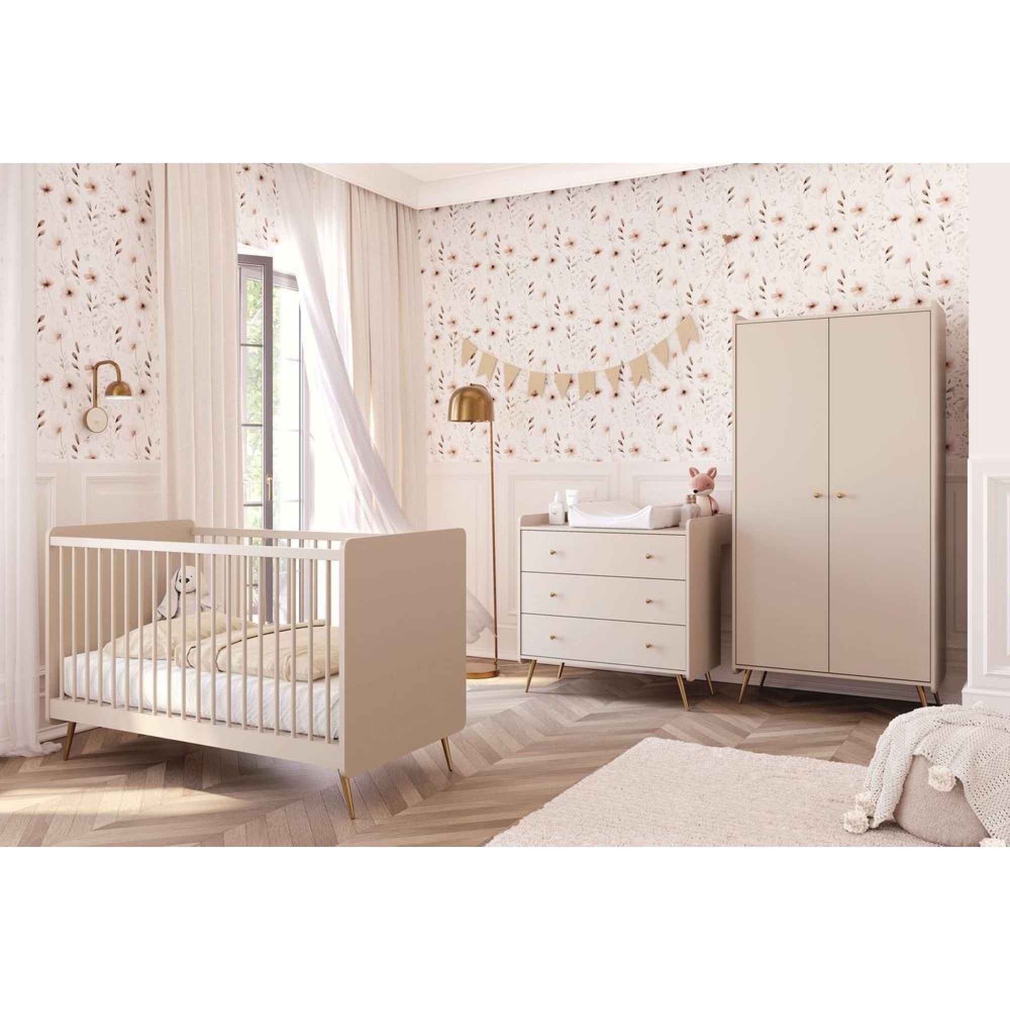 La chambre Lunea combine esthétisme et fonctionnalité pour créer un espace confortable, organisé et évolutif. Le lit 70x140 cm se transforme en canapé et dispose d’un sommier ajustable sur trois niveaux pour accompagner chaque étape de croissance. La commode offre un rangement optimal avec ses trois tiroirs spacieux et silencieux, parfaits pour les vêtements et accessoires du quotidien. L’armoire 2 portes complète l’ensemble avec son grand volume de rangement, incluant tringle et étagères modulables pour s’adapter à vos besoins. Grâce à leurs lignes arrondies, leurs teintes sable beige et leurs détails dorés, ces meubles créent une ambiance douce, raffinée et intemporelle dans la chambre de votre enfant.
