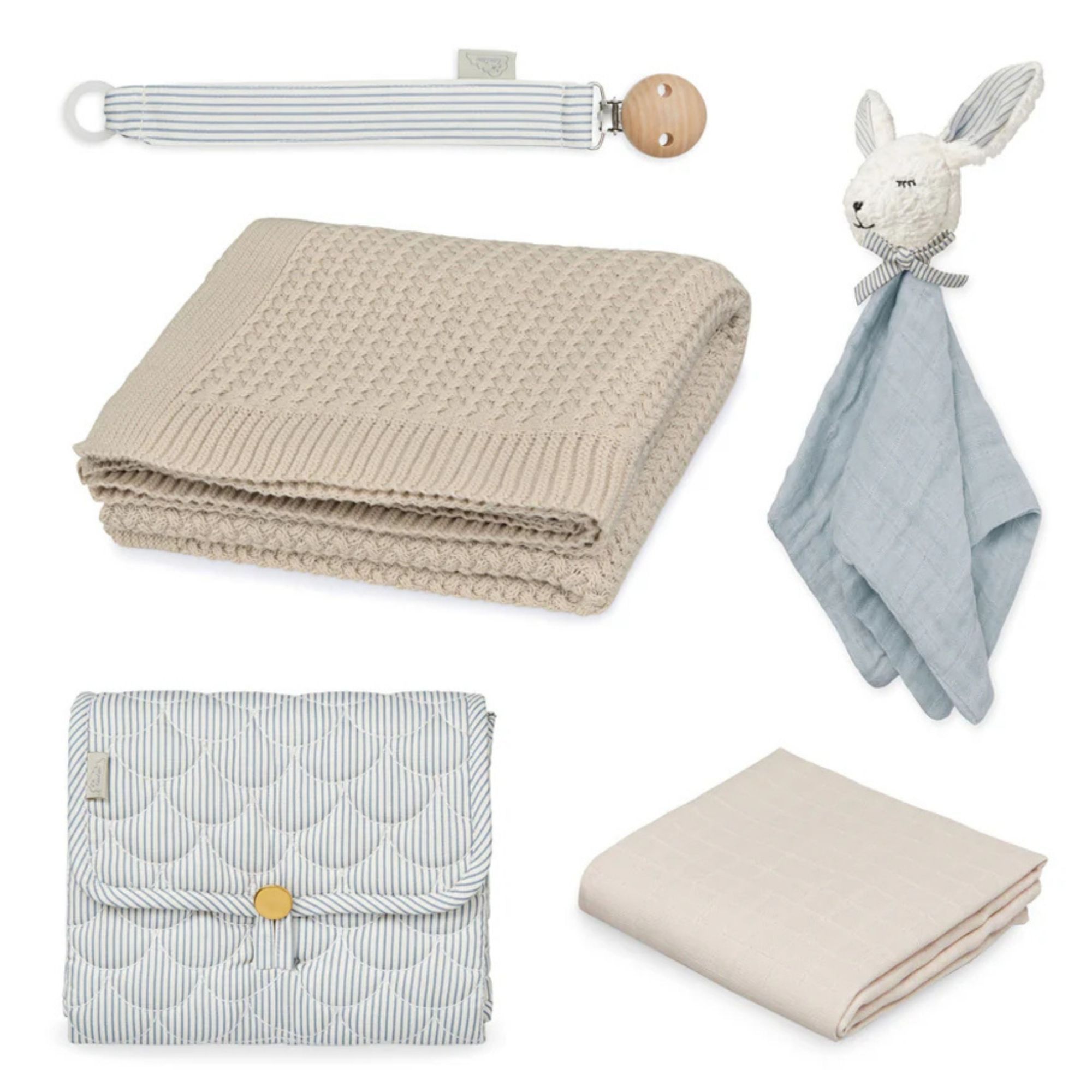 Ce coffret est composé d'1 plaid bébé en tricot pointelle Harper, 1 doudou Lapin, 1 linge en mousseline, 1 porte-sucette et 1 matelas à langer. Ce coffret bébé contient des produits de haute qualité et indispensables dès la naissance de bébé. Une jolie idée cadeau !
