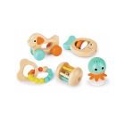 Découvrez le coffret sensoriel multi-étapes Hape qui réunit 5 jouets d’éveil essentiels pour stimuler les sens et la coordination de votre bébé dès ses premiers mois. Chaque pièce est conçue pour développer une compétence clé chez l'enfant : le hochet poisson favorise l’éveil auditif, l’anneau de dentition perlé soulage les gencives et stimule le toucher, le hochet ventouse reste en place pour jouer sans le faire tomber, le hochet à roulettes et le chien à tirer encouragent la motricité et l’exploration. Les formes arrondies, les couleurs douces et les textures variées offrent une expérience sensorielle complète adaptée aux petites mains.