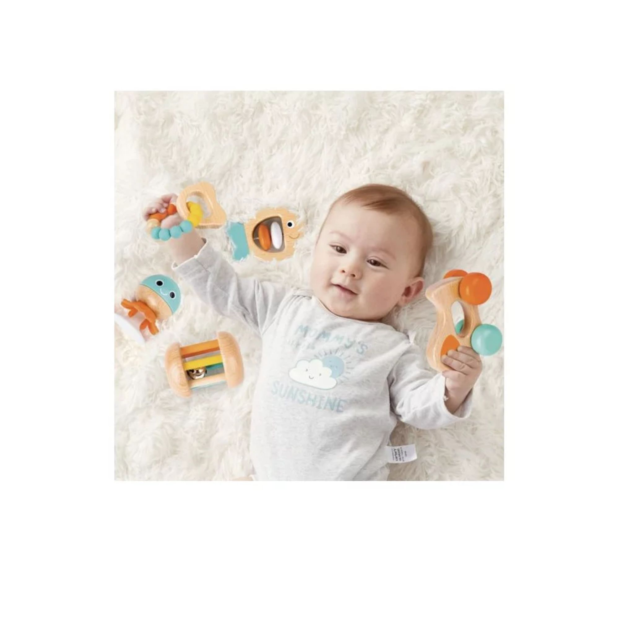 Contenu : 5 jouets (hochet poisson, anneau perlé, hochet ventouse, hochet à roulettes, chiot à roulettes)