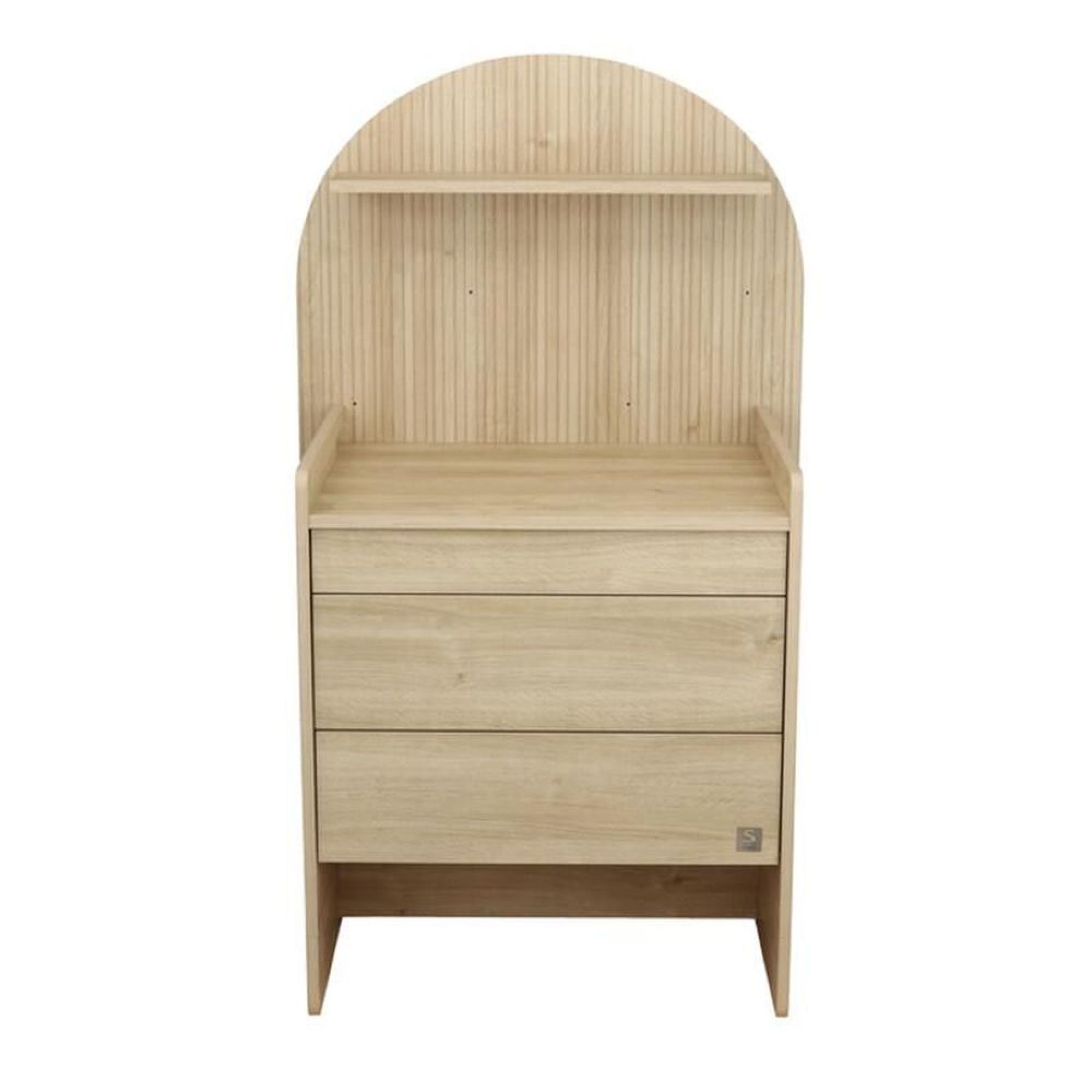 Elle dispose de 3 grands tiroirs spacieux, équipés d'un système de fermeture douce ("Soft Close") pour éviter de se pincer les doigts et pour ne pas réveiller bébé avec un bruit sec. On retrouve les pieds en hêtre verni et les poignées intégrées qui font le charme de la gamme Arche. C'est la particularité de la gamme évolutive Sauthon. Lorsque l'enfant grandit et a besoin d'un espace de travail, la structure peut être réagencée pour devenir un véritable bureau junior. Le plateau offre une surface de travail confortable pour les premiers devoirs ou les activités créatives.