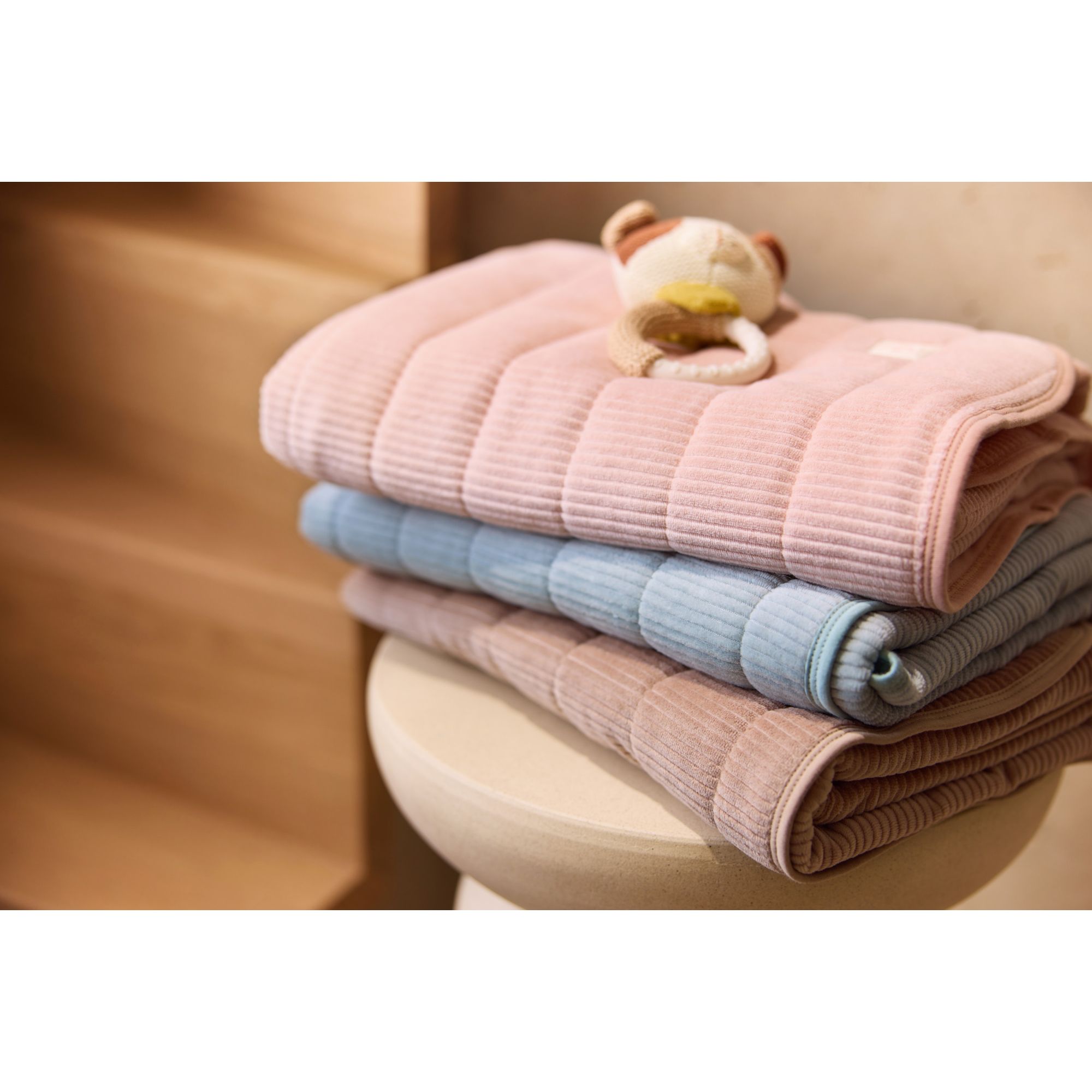 La couverture Velvet Rib associe esthétisme et praticité. Son tissu côtelé élégant lui donne un aspect raffiné, tandis que son intérieur moelleux apporte la chaleur nécessaire pour les moments de repos. Grâce à son format polyvalent, elle s’utilise aussi bien dans la chambre que lors des sorties en poussette.