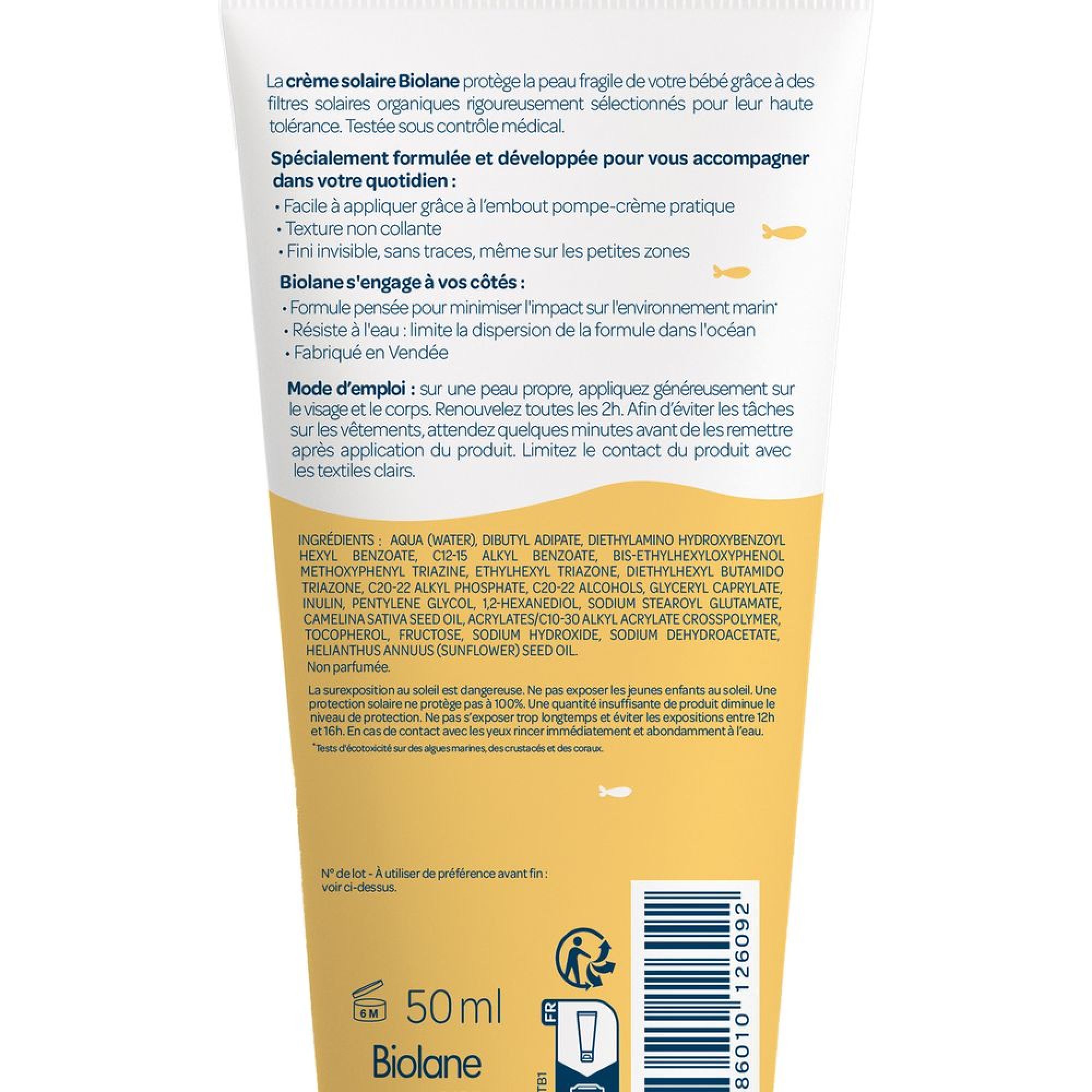 Découvrez la crème solaire 50ml de la marque Biolane. Testé sous contrôle médical, cette crème solaire haute protection SPF 50 est formulé à base de filtres solaires organiques de dernière génération, garantissant une protection efficace contre les rayons UVA et UVB dès la naissance. Sa texture légère et agréable s'applique facilement, sans laisser de résidus blancs, et sa formule résistante à l'eau permet une protection durable même lors des baignades. Complétez vos achats avec les produits de la marque: couches , lingettes ,stick anti moustique....