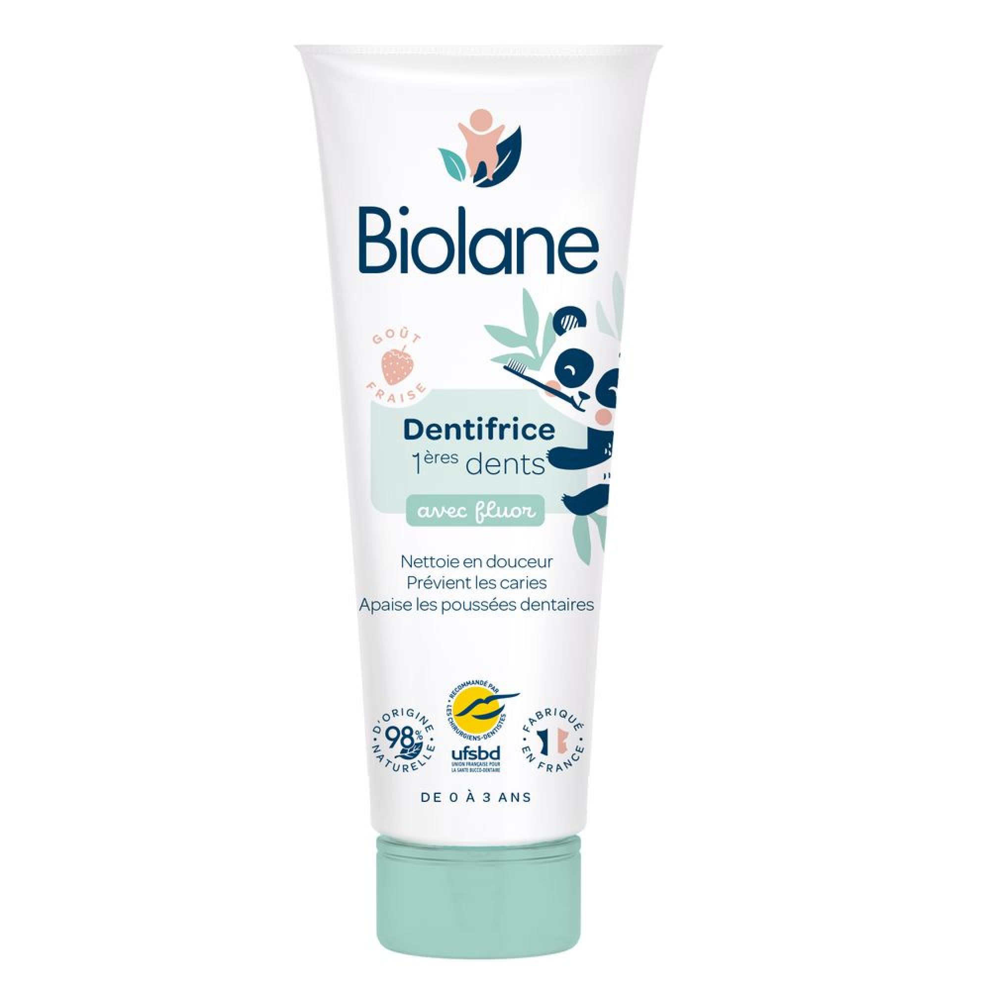Découvrez le dentifrice enfant arome fraise de la marque Biolane. Spécialement formulé pour prendre soin des premières dents et des gencives sensibles de votre bébé. Ce dentifrice 2-en-1, à la fois nettoyant et apaisant, est idéal pour accompagner votre bébé dans sa routine d'hygiène bucco-dentaire dès les premières poussées dentaires.