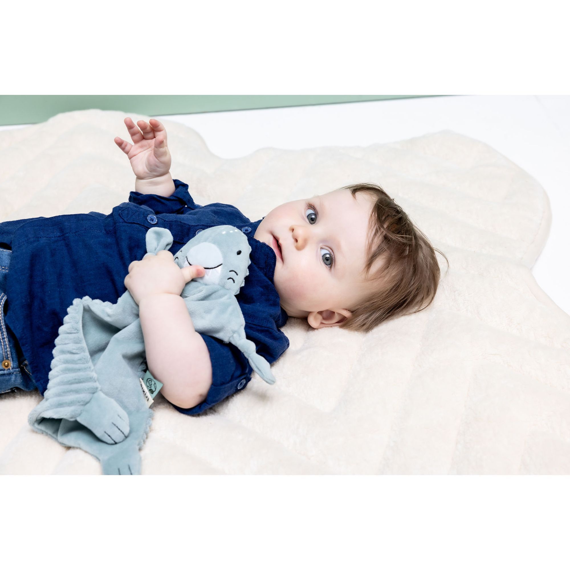 Découvrez le doudou en velours côtelé - Mr. Shark de Trixie, le compagnon idéal pour apaiser et rassurer votre bébé au quotidien. Confectionné en coton biologique et polyester recyclé, ce doudou allie douceur, praticité et durabilité. Sa texture moelleuse en velours côtelé recyclé et tissu velboa crystal offre un toucher ultra-doux. Grâce à son attache-tétine intégrée, la sucette reste toujours à portée de main, évitant les pertes et les frustrations.