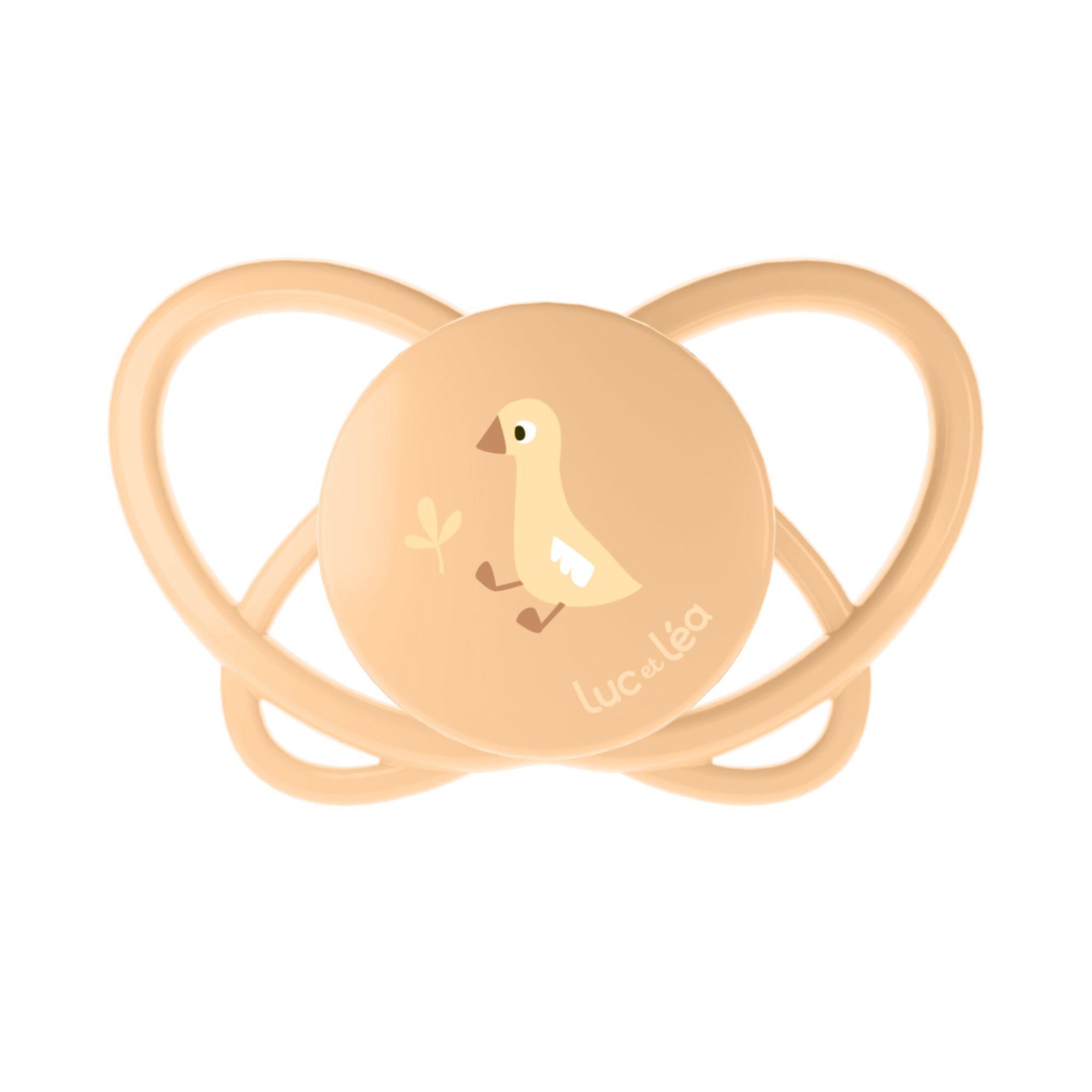 Le duo de sucettes physiologiques Oie Luc et Léa est fabriqué en silicone médical de qualité. Leur téterelle fine et souple épouse la forme du palais, tandis que la collerette légère limite les frottements sur la peau sensible. Avec leurs décors tendres, elles allient douceur et sécurité au quotidien.