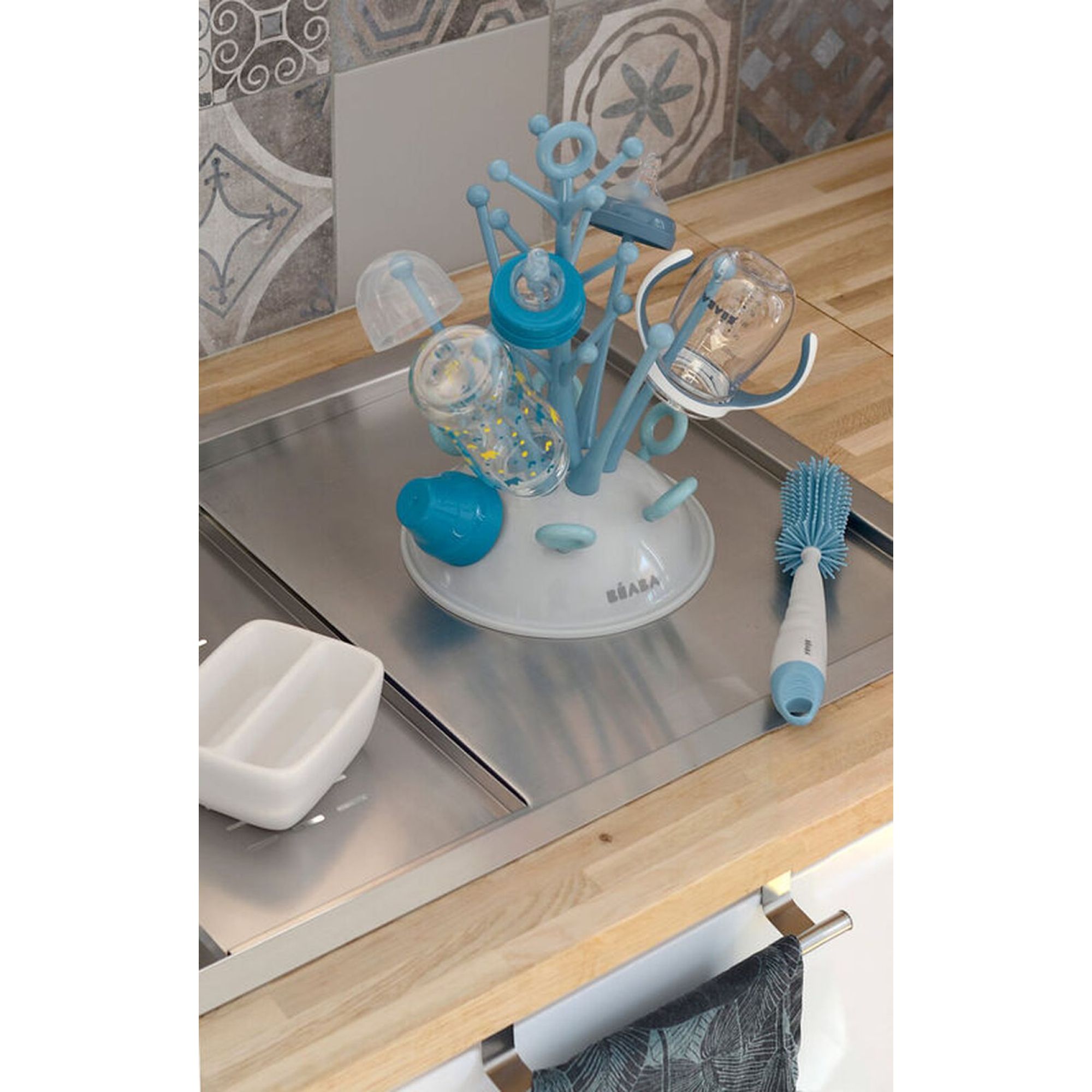 Astucieux et fonctionnel, l’égoutte biberons Arbre de la marque Béaba est conçu pour faire sécher plusieurs biberons et leurs accessoires simultanément, tout en optimisant l’espace sur le plan de travail. Sa forme en arbre permet de suspendre aisément biberons, tétines, bagues et capuchons, pour un séchage rapide à l’air libre. Sa base stable et amovible recueille l’eau de ruissellement pour éviter toute stagnation. Facile à démonter, à vider et à nettoyer, il s’intègre parfaitement dans toutes les cuisines grâce à son design sobre et compact.
