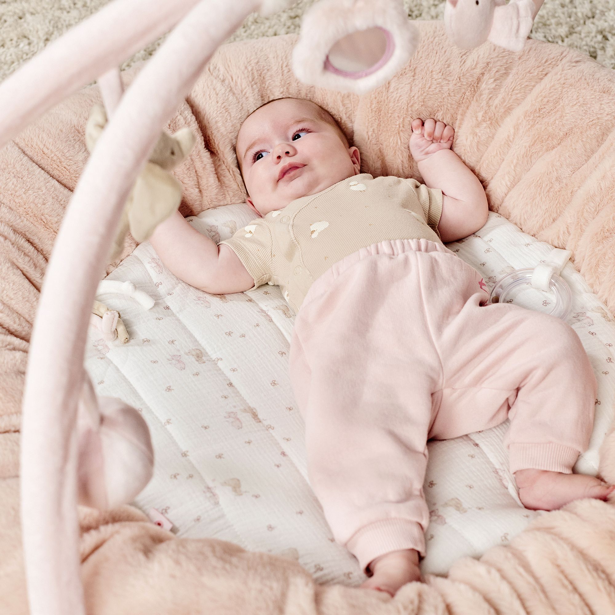 Ce tapis d'éveil avec arches propose de nombreuses activités. Il est équipé de miroir, pouet pouet, papier froissé ainsi que des peluches. Ce tapis d'éveil tout doux permettra à bébé de s'amuser et découvrir tous les jouets qui lui sont proposés. Votre petit bout pourra s'asseoir à l'intérieur du tapis en toute sécurité.