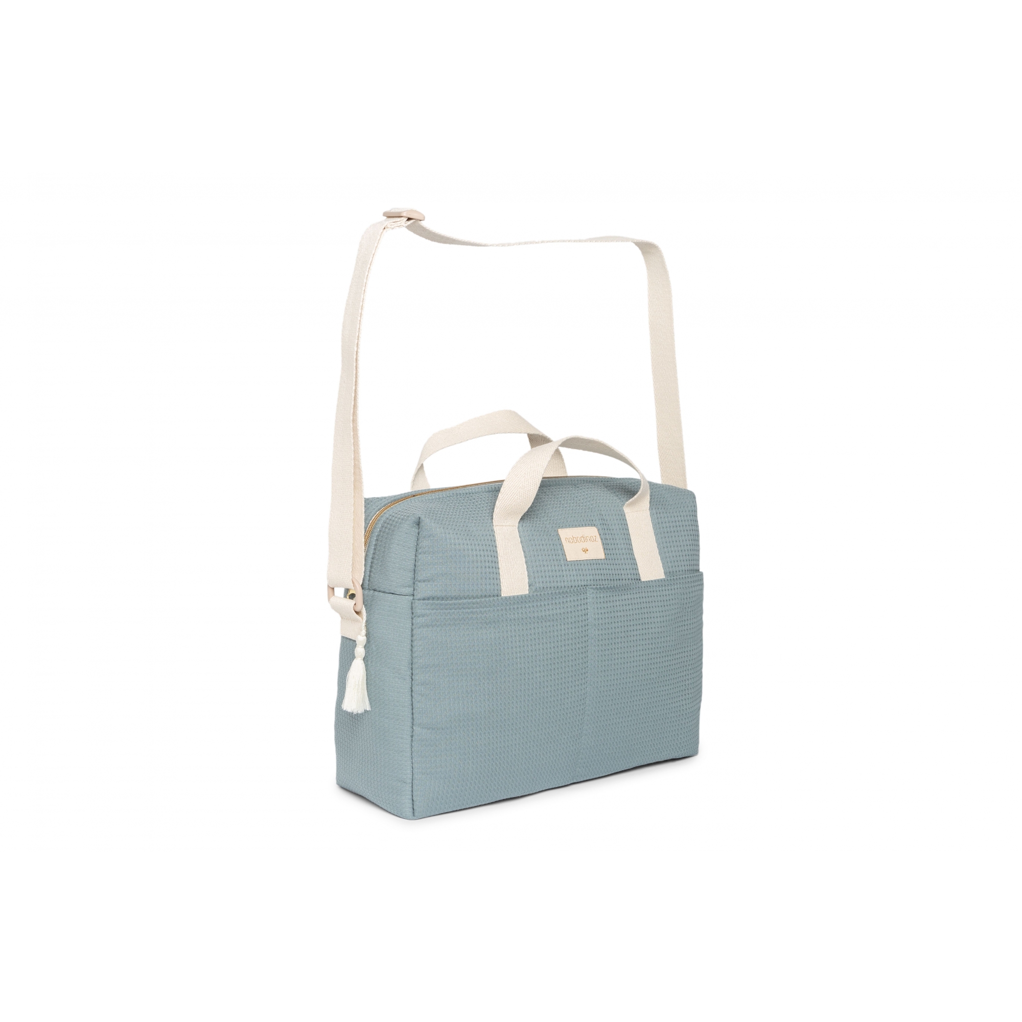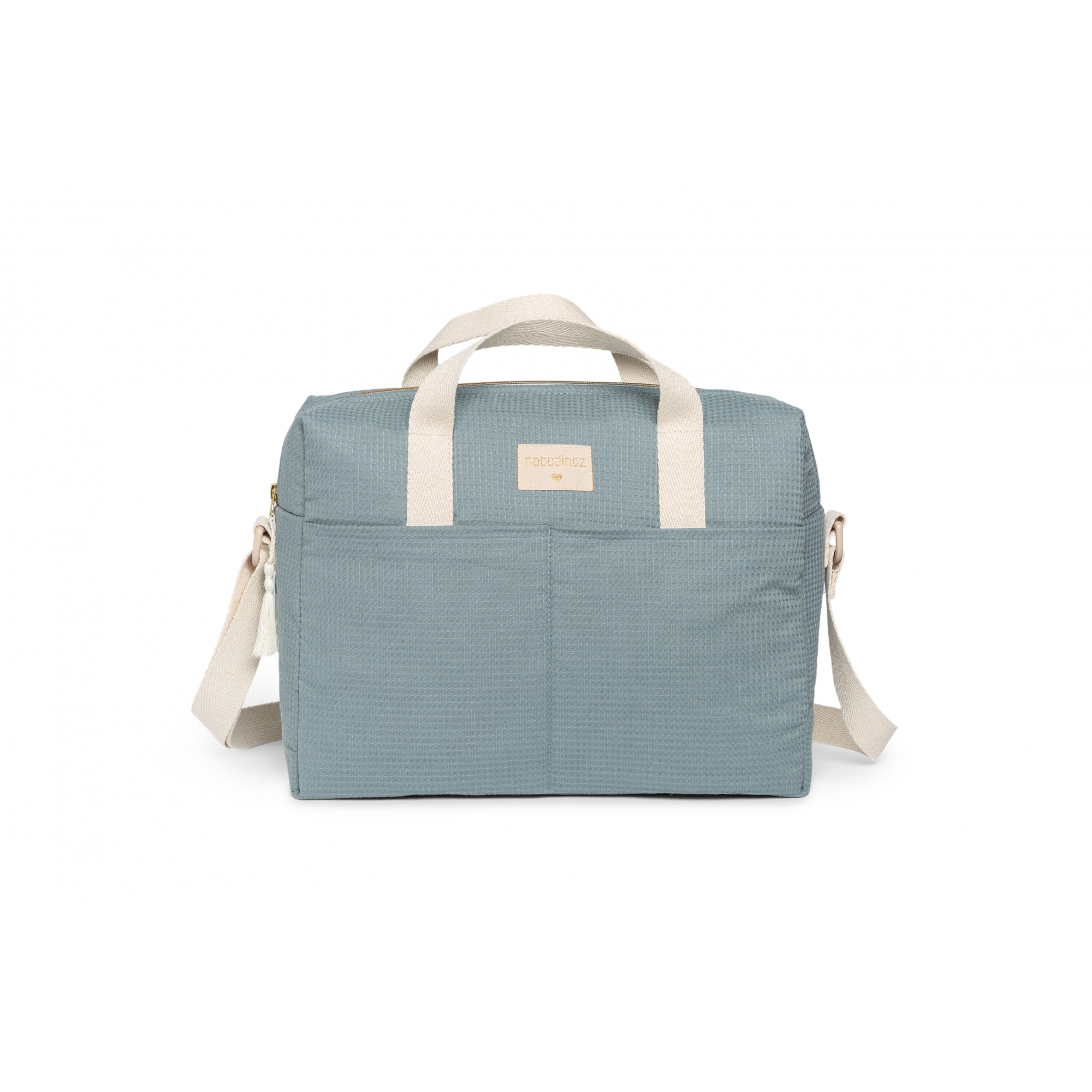 Optez pour le sac à langer Gala nid d'abeille Stone Blue de la marque Nobodinoz. Avec son coton bio nid d'abeille et ses poches de rangement, ce sac de maternité sera idéal pour préparer les affaires de votre bébé pour le jour J. Il deviendra ensuite un sac à langer ou un sac week-end au top du style ! Il est disponible en plusieurs coloris.