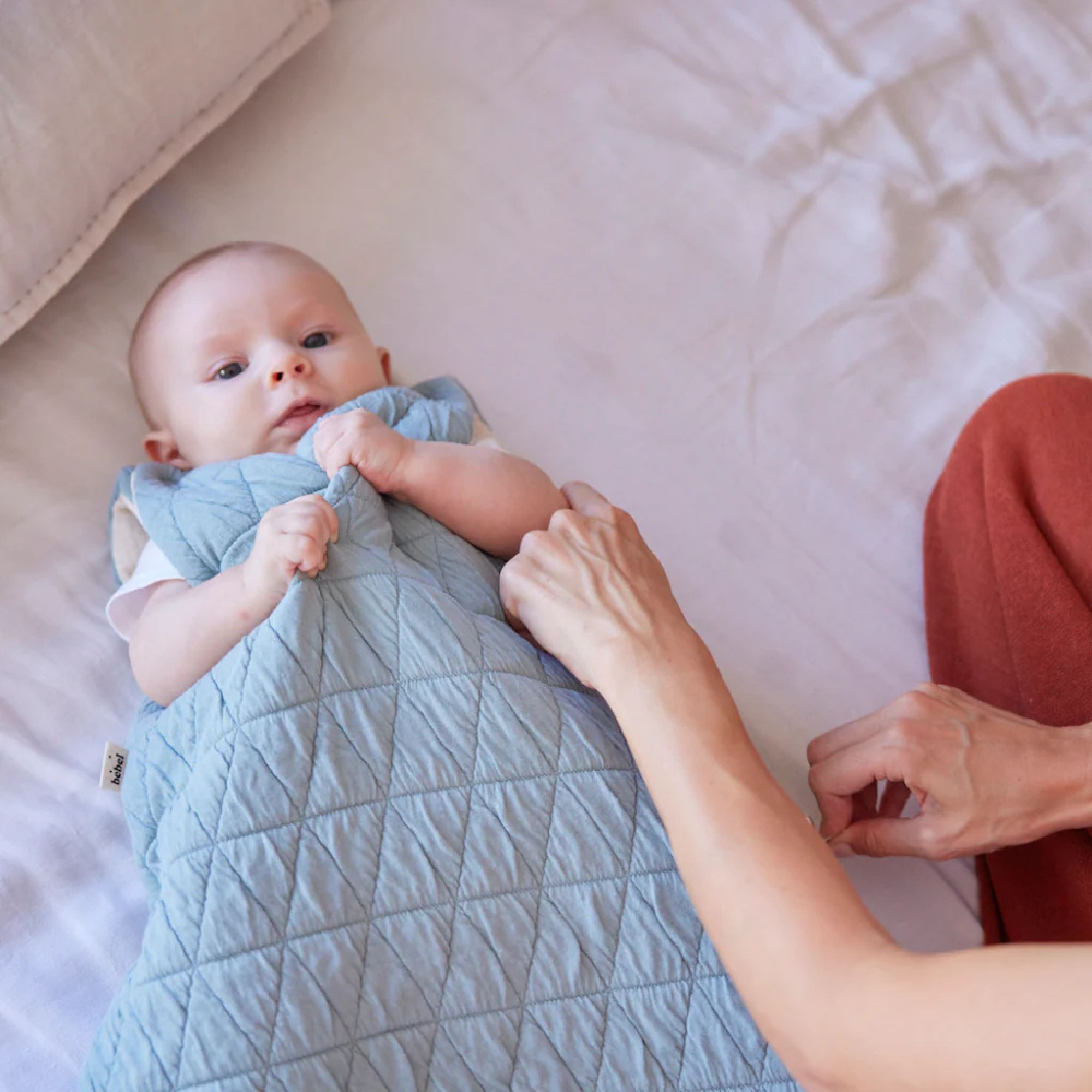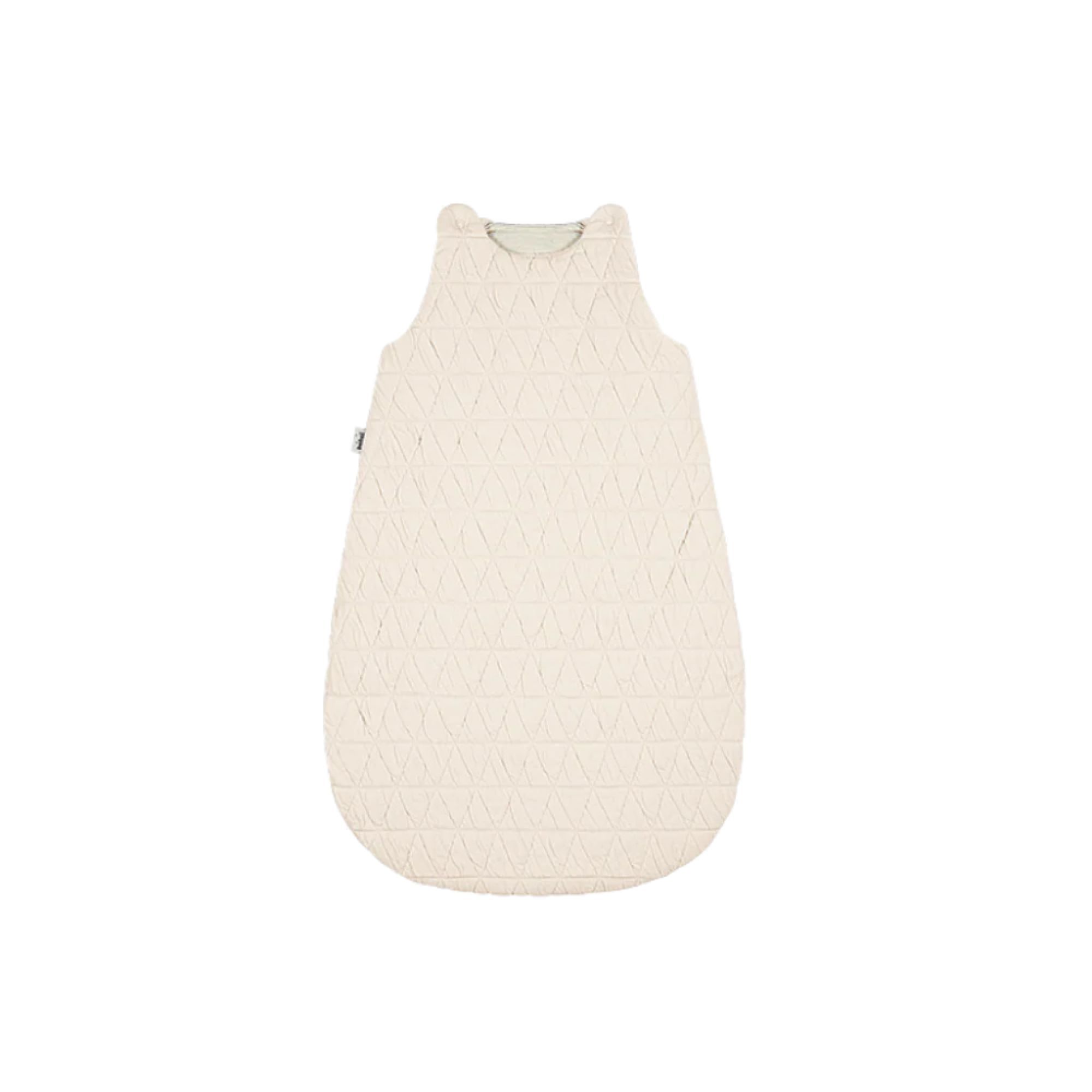 La gigoteuse est fabriquée en tissu certifié Oeko-Tex, avec un intérieur en double gaze crème. Elle se ferme par pressions aux épaules et un long zip latéral, facilitant l'habillage et le change nocturne. Disponible en deux tailles : 70 cm (0-6 mois) et 90 cm (6-24 mois).