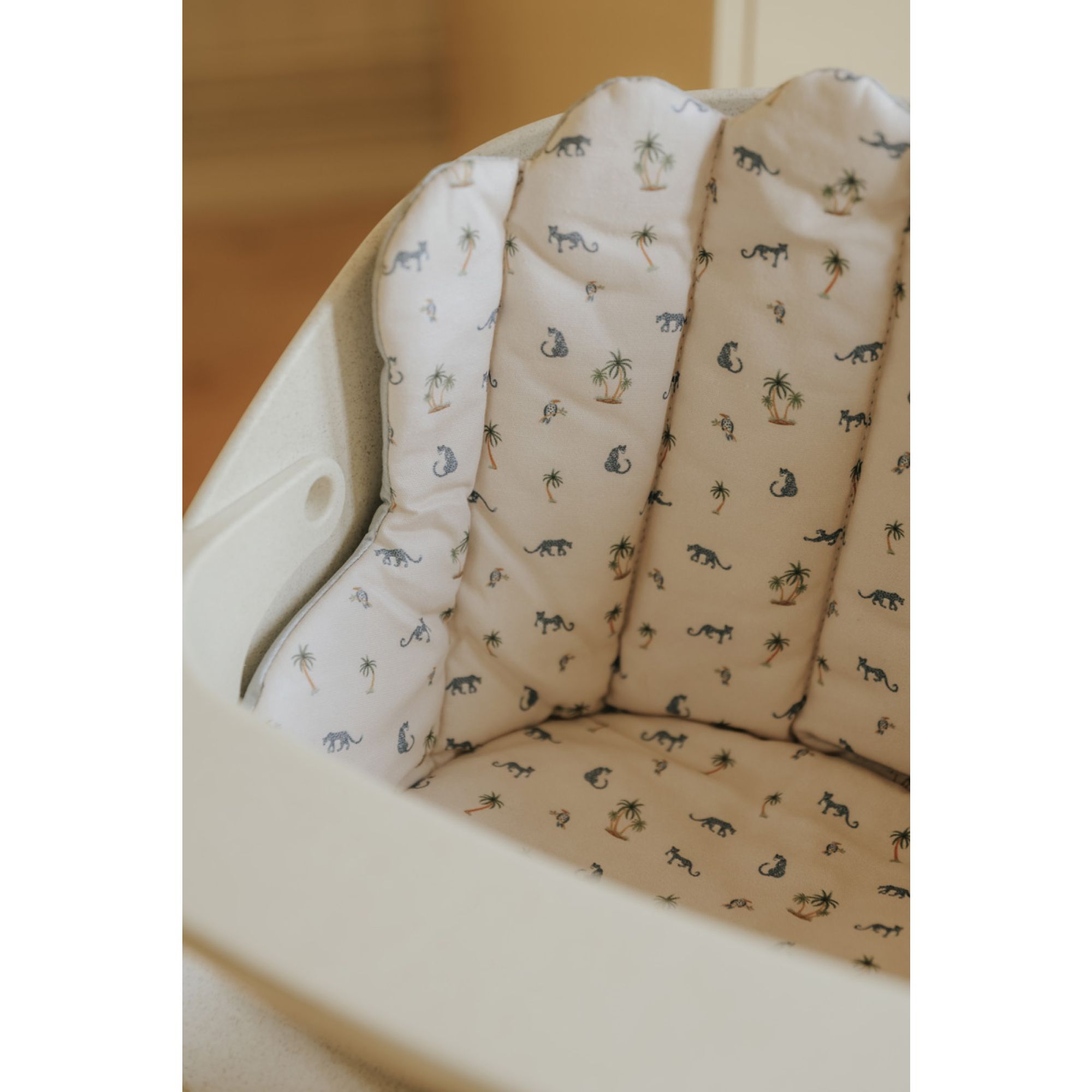 Le coussin Grace est conçu pour s’adapter parfaitement à la chaise haute grâce à ses ouvertures prévues pour le harnais à trois points. Sa surface en coton résistant avec finition déperlante facilite le nettoyage quotidien. Réversible, il permet d’alterner les styles selon vos envies ou après un petit accident de repas.