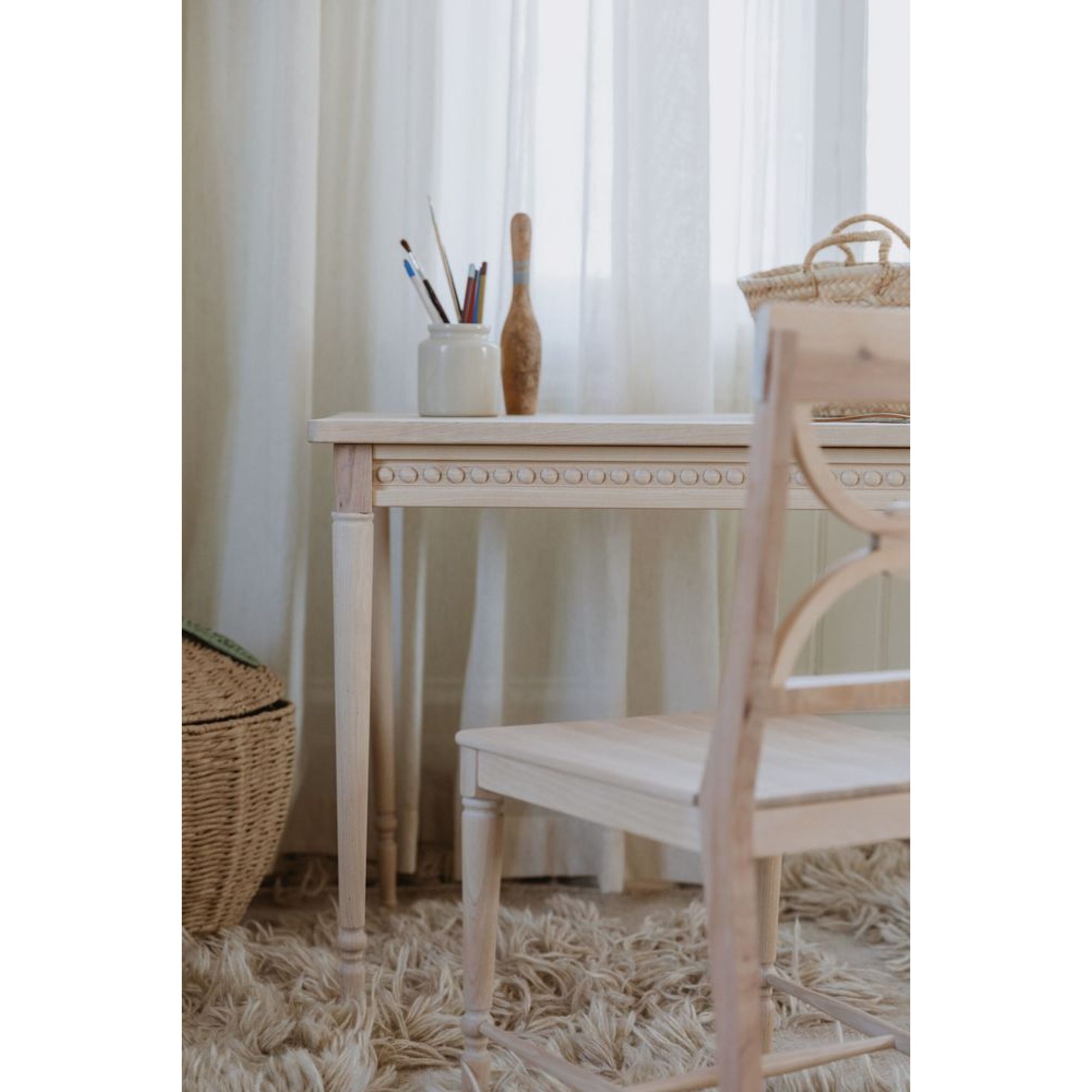 Choisissez le bureau enfant en bois Naturel de la marque Gustavienne. Fabriqué en bouleau massif , les pieds en bois tournés accueille un cadre entouré de perles sculptées sur lequel repose un plateau aux bords arrondis pouvant se soulever comme un bureau d’écolier. Votre enfant y rangera livres de coloriages, crayons et petits secrets. Il servira au quotidien pour y jouer, étudier ou prendre son goûter. Pensez à la chaise accordée de la marque .