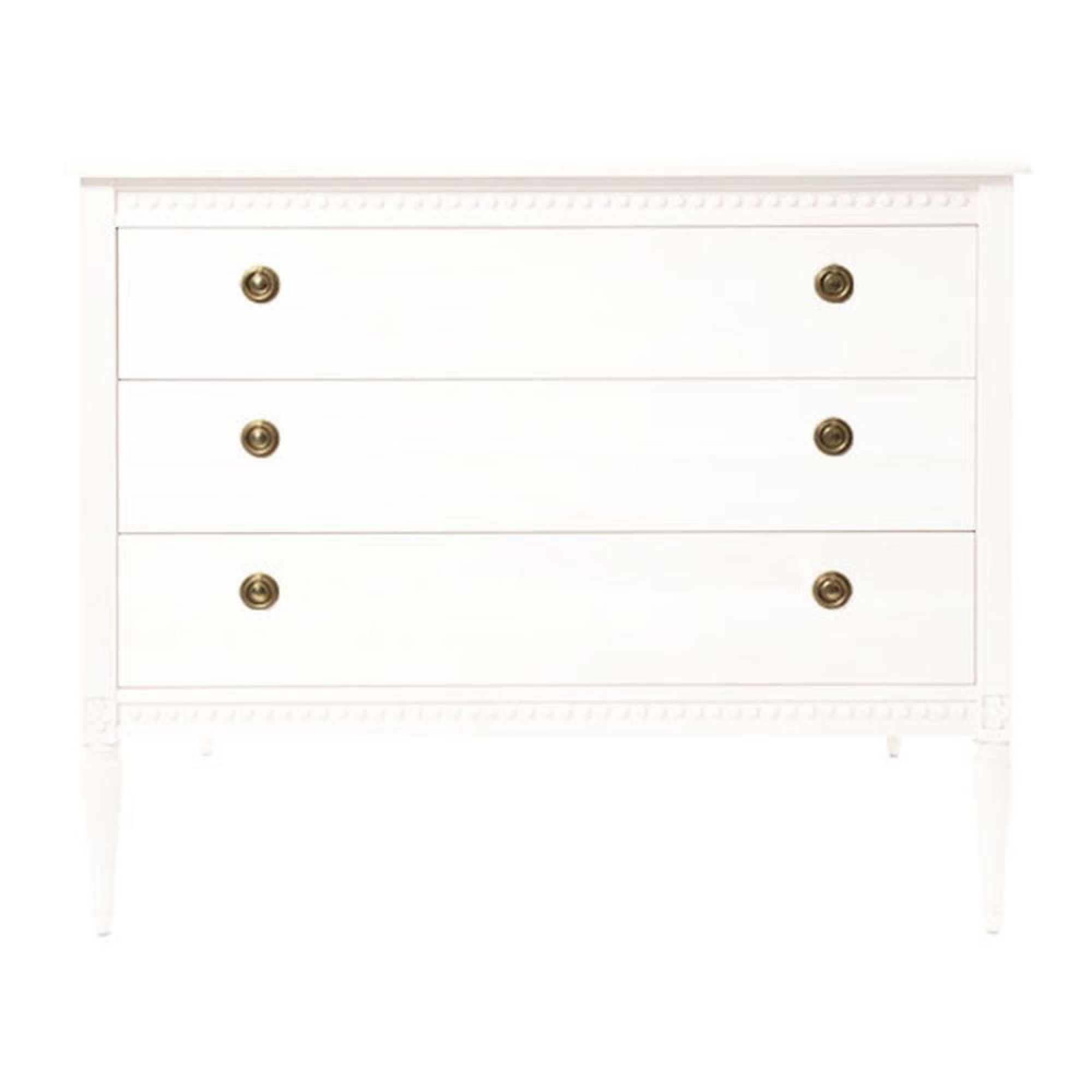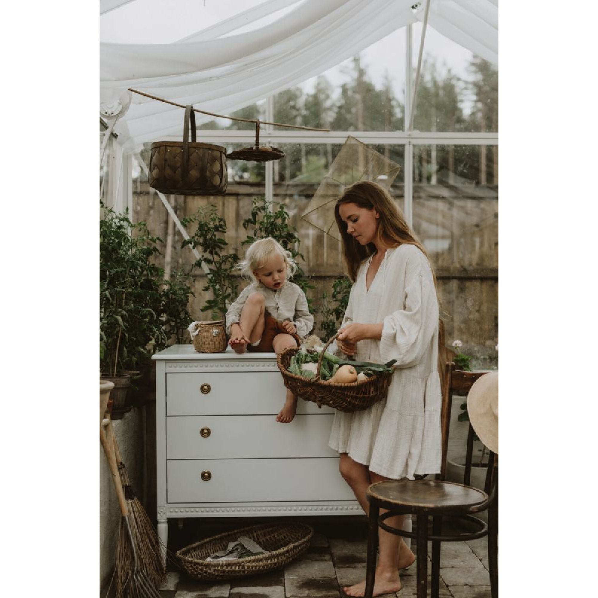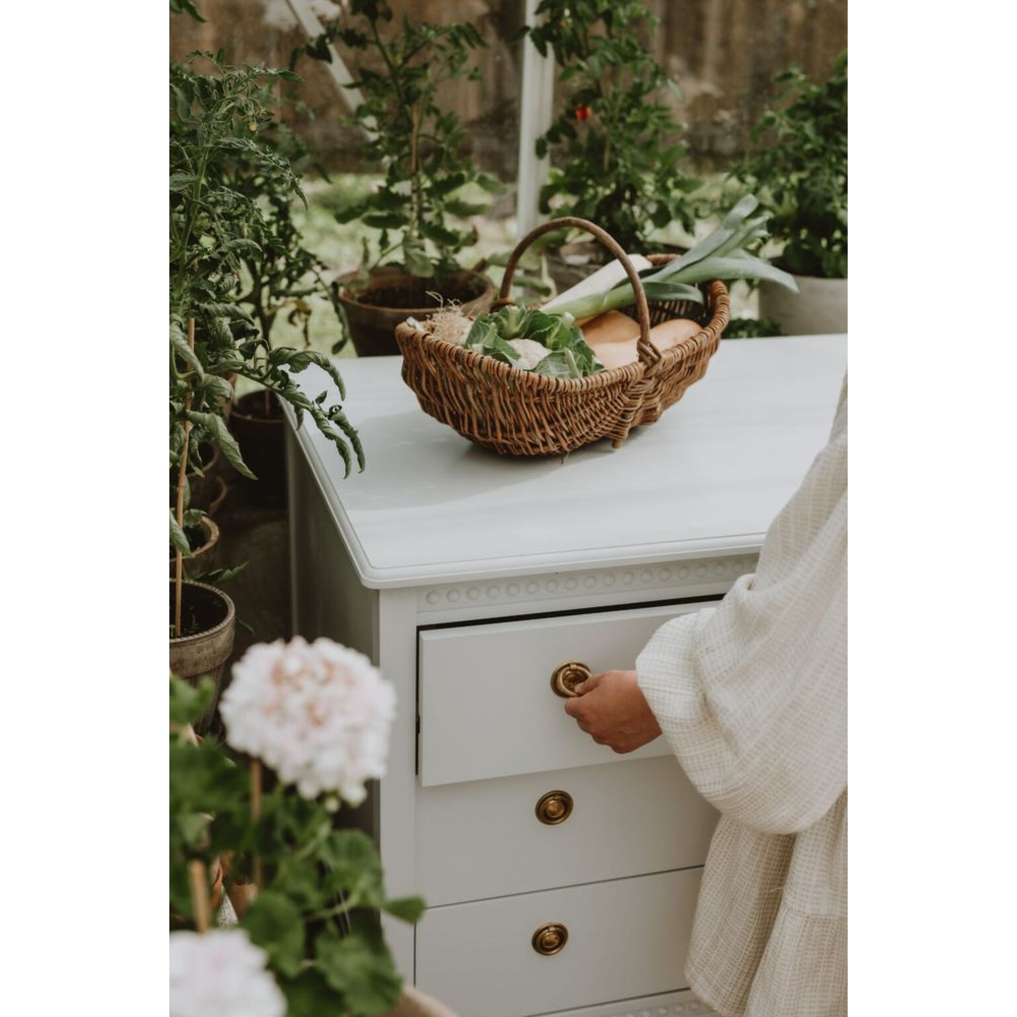 Craquez pour la superbe commode Blanche, 3 tiroirs de la marque Gustavienne. Entièrement réalisée en bois massif de bouleau, la commode Gustavienne offre une grande capacité de rangement avec ses trois profonds tiroirs assemblés selon une ancienne méthode qui a fait ses preuves : l’ assemblage à queue d’aronde, évitant la visserie apparente. Vêtements, accessoires de toilette, couches, linge de maison ou jouets peuvent y être rangés. Les poignées en laiton massif, fabriquées de manière locale et artisanale en Suède donnent du cachet aux façades.Le plateau massif épais aux angles arrondis, souligné par une rangée de perles peut accueillir divers objets tels que jouets, livres, albums, lampe, mais aussi le plan à langer Gustavienne.