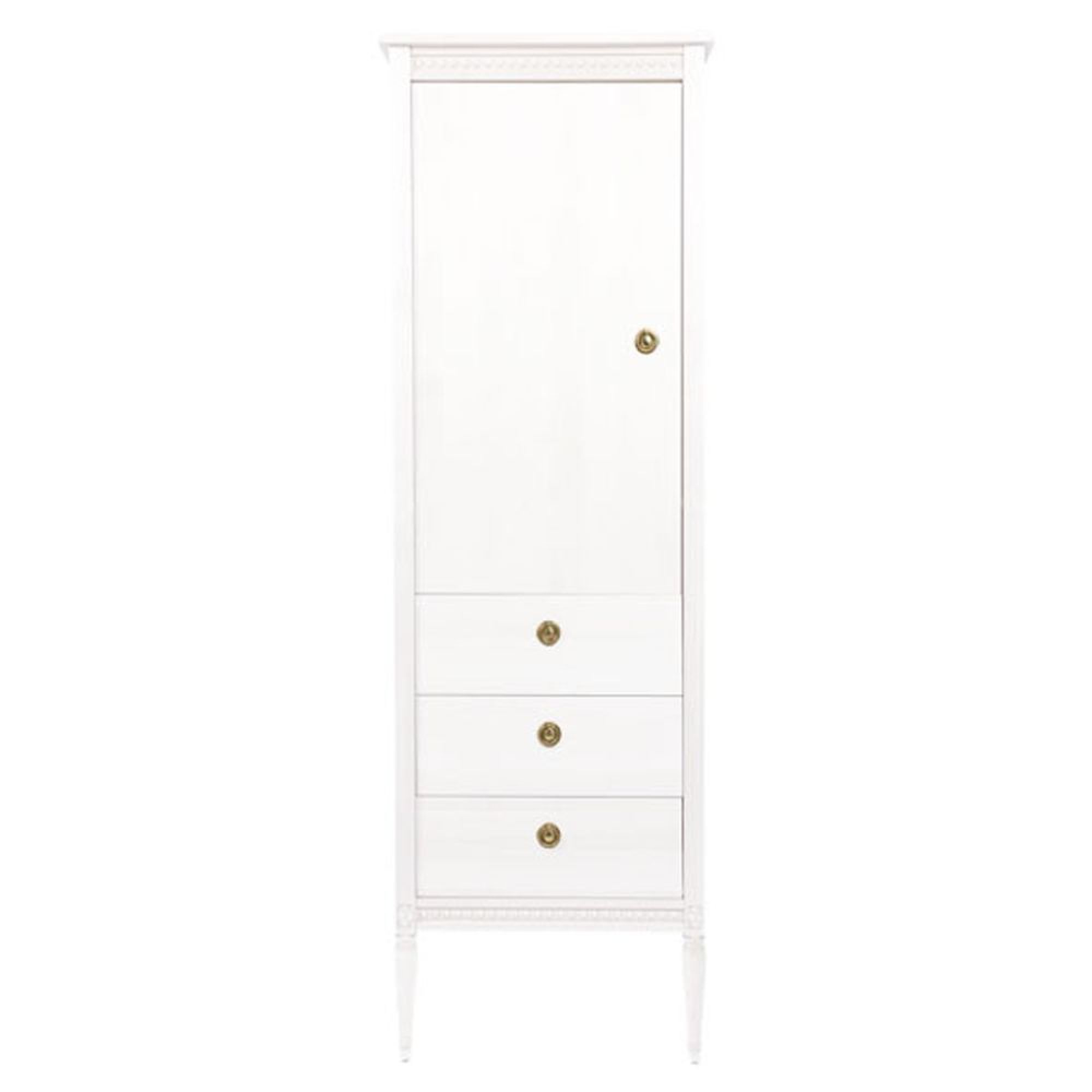 Craquez pour l'armoire Blanche, 1 porte de la marque Gustavienne.Entièrement en bouleau massif, la bonnetière Gustavienne est composée d’un espace intérieur penderie équipé d’une tringle pour vêtements sur cintre, ou de deux étagères amovibles.Ces modules sont fournis pour permettre de répondre aux besoins en fonction de l’évolution de votre enfant. 3 tiroirs de rangement viennent en dessous offrant une grande capacité de rangement.Toutes les poignées des façades (porte et tiroirs) sont en laiton massif fabriquées artisanalement en Suède. Les perles sculptées contournent les cadres à la base, et en haut de l’armoire. Le chapeau est un plateau aux angles arrondis en bois épais pouvant également recevoir des objets de décoration.