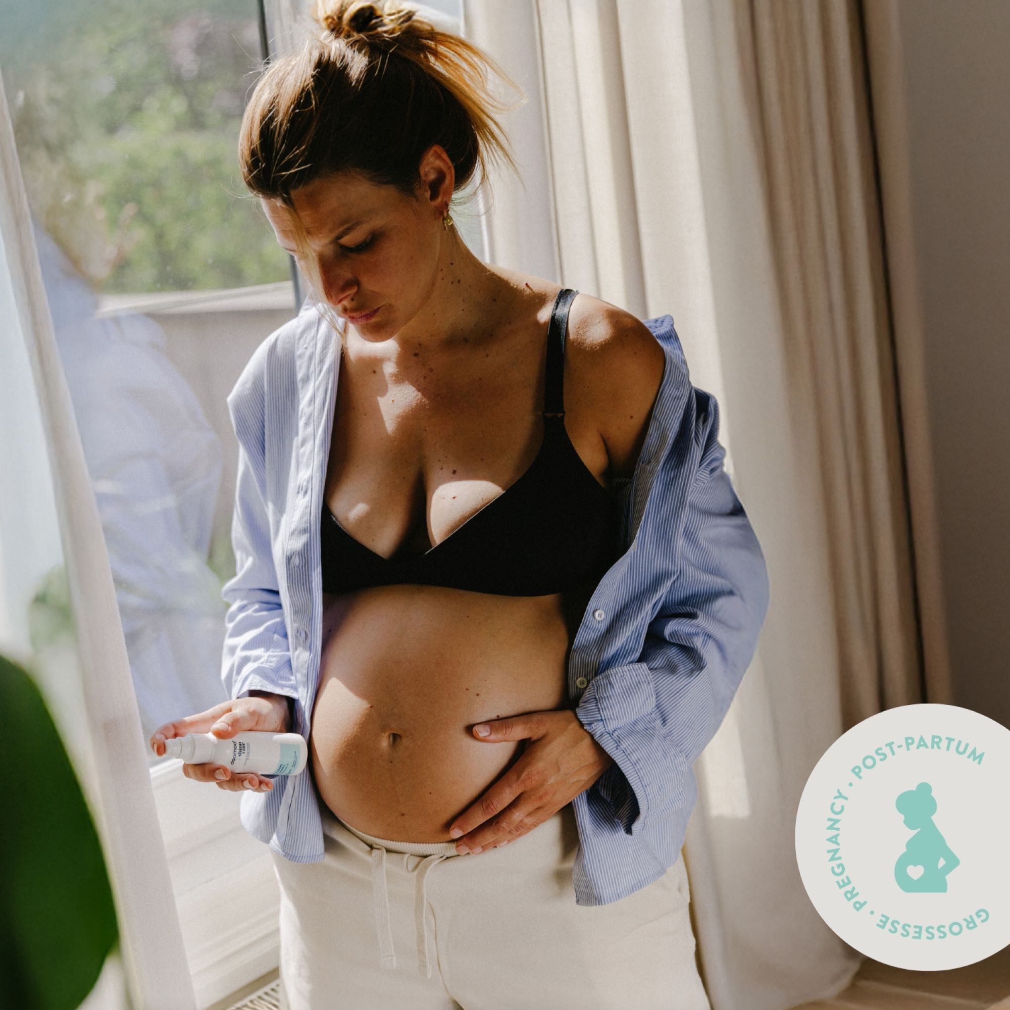 Utilisation : À utiliser matin et soir dès le début de la grossesse et en post-partum. Déposez quelques gouttes au creux de vos mains et effectuez des mouvements circulaires sur le ventre, les hanches, la poitrine et les cuisses