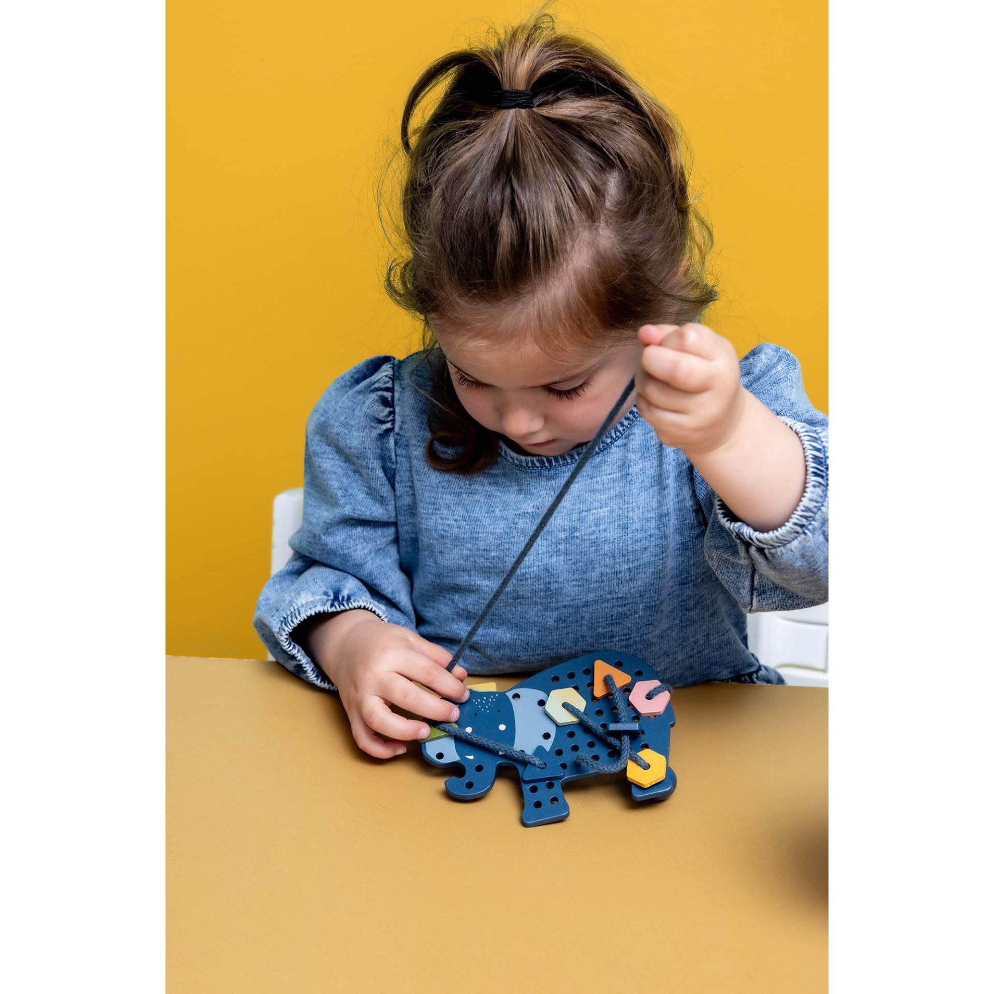 Découvrez ce jeu de laçage bois animaux bébé - All animals de la marque Trixie. Avec Mme Éléphant et ses amis, l’enfant découvre le plaisir de créer et de manipuler grâce à un jeu de laçage intelligent et poétique. À l’aide de ficelles colorées et de perles en bois, il décore chaque animal en faisant passer le fil à travers les trous. Ce geste simple devient une merveilleuse exercice de motricité fine, de coordination main-œil et de concentration. C’est aussi la première étape avant d’apprendre à lacer ses chaussures ! Fabriqué en bois certifié FSC® et peint avec des couleurs à l’eau sans substances nocives, ce jouet allie qualité, sécurité et durabilité. Un jeu éducatif, créatif et apaisant, parfait pour accompagner l’enfant dans ses premières réussites.