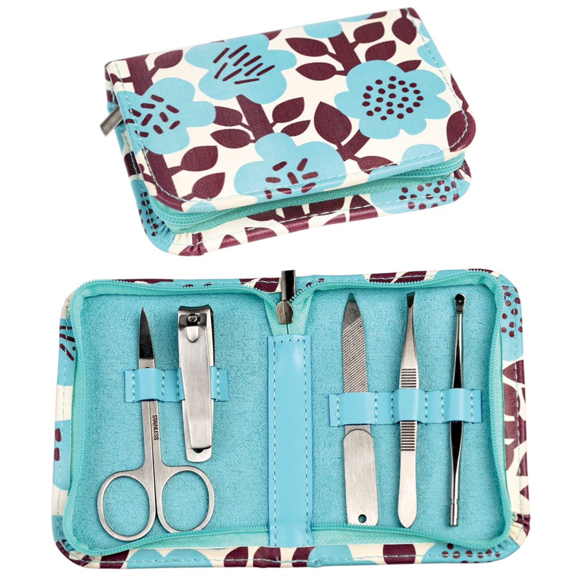 Comprends : Une paire de ciseaux à ongles, un coupe-ongles, une lime à ongles, des pincettes et un poussoir à cuticules