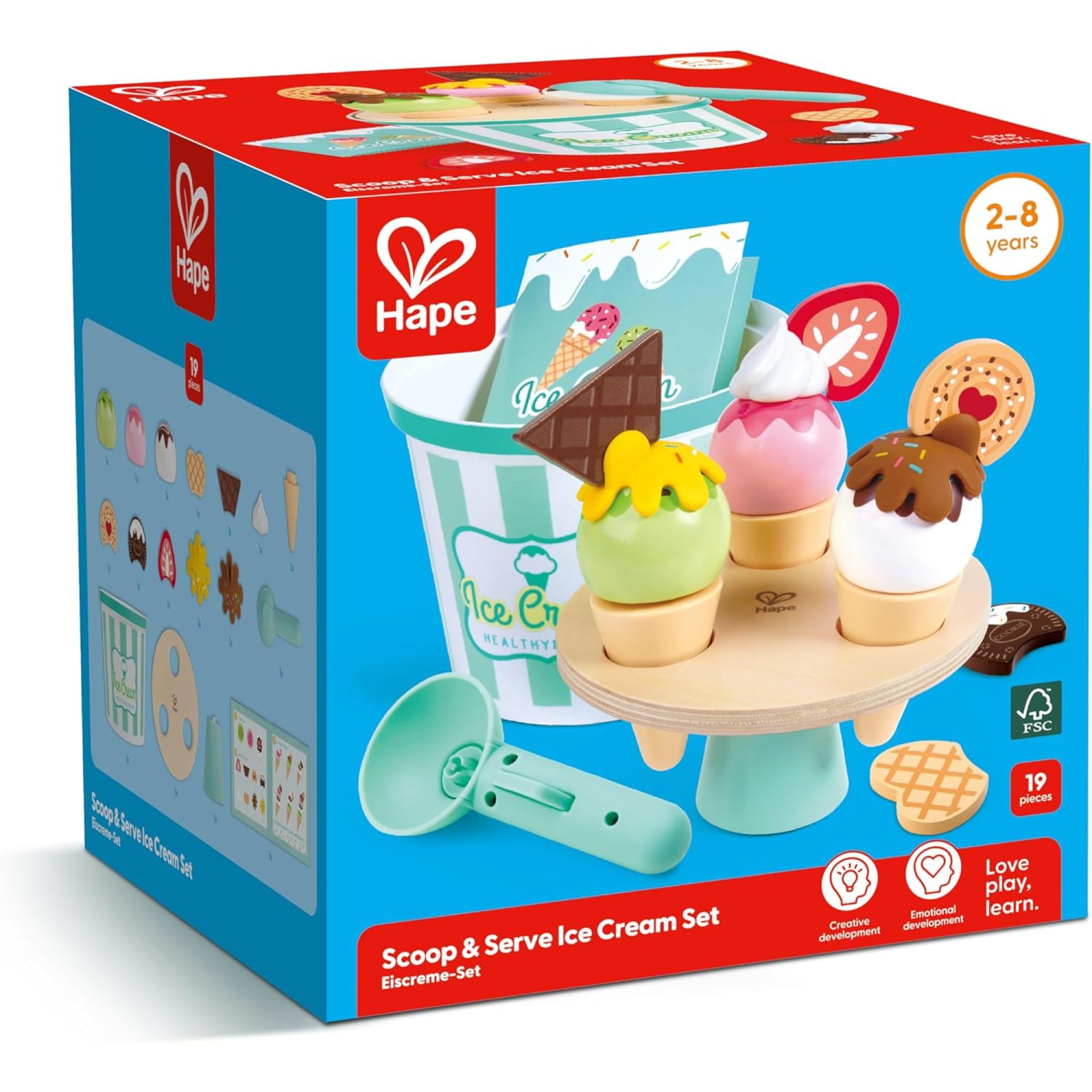 Découvrez le kit de glaces avec support est un jeu en bois éducatif et créatif Hape qui invite les enfants à fabriquer et personnaliser leurs glaces comme de vrais pâtissiers. Avec ses 3 boules colorées, 3 sauces et 5 garnitures, les petits pourront inventer d’innombrables combinaisons gourmandes et s’amuser à les présenter sur le présentoir rotatif inclus. Le seau et la cuillère fonctionnelle rendent le jeu encore plus réaliste, tout en stimulant la motricité fine, la coordination œil-main et l’imagination. Idéal pour encourager le jeu collaboratif, ce set développe également les compétences sociales et le langage des enfants. Fabriqué en bois lisse et durable, sans BPA, ce jouet sûr et écologique garantit des heures de plaisir en toute sécurité.