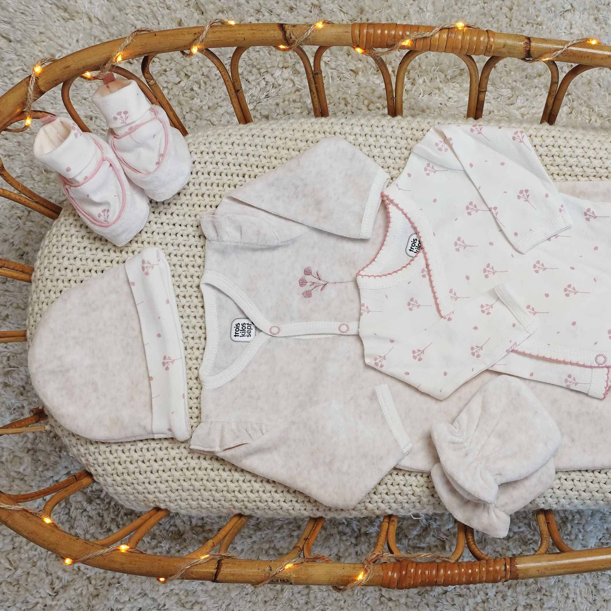 Découvrez ce kit naissance 6 pièces de la marque Trois Kilos Sept. Il a été spécialement conçu pour les bébés dès la naissance. Ce kit vêtement naissance comprend un pyjama, un bodie, un bonnet ainsi qu'une paire de moufles, une paire de chaussons et un sac de rangement. C'est le cadeau idéal pour la venu d'un petit bout !