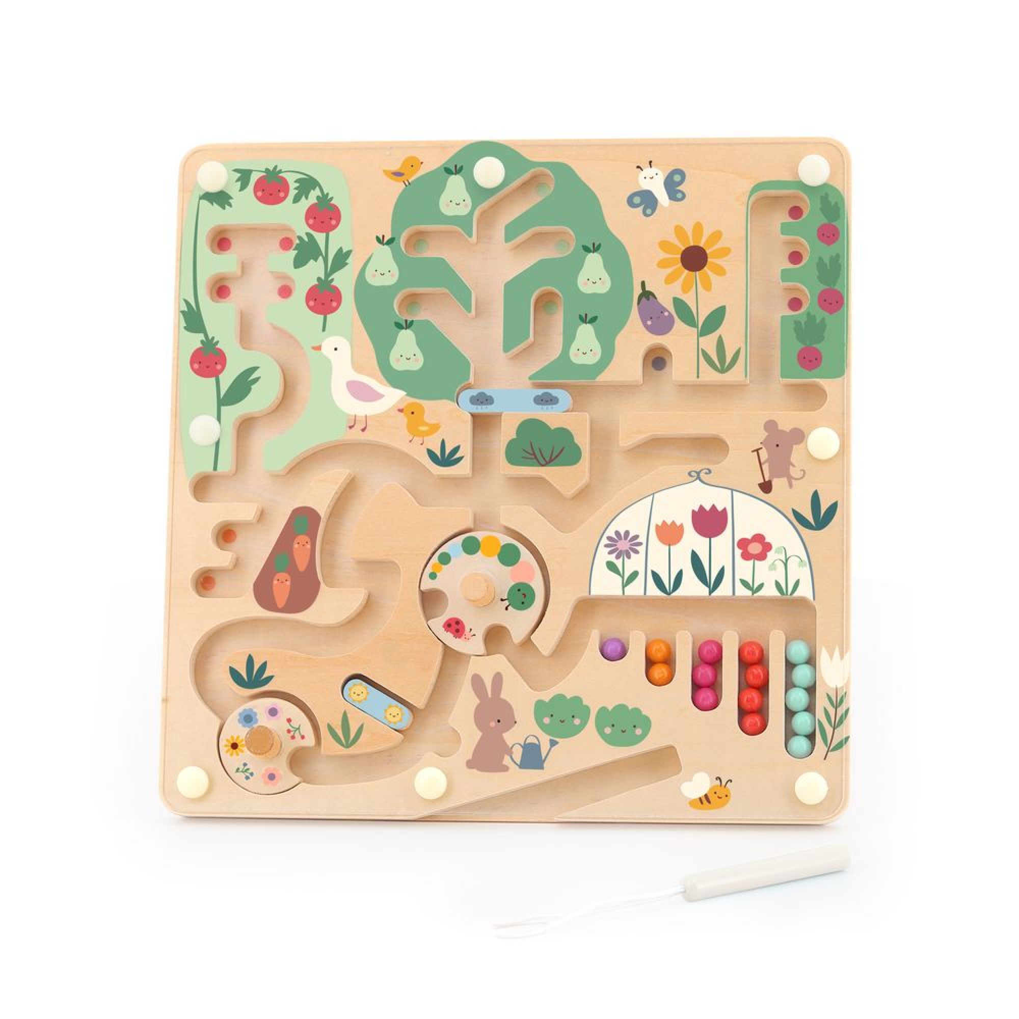 Pour déplacer les billes dans le labyrinthe, votre enfant aura besoin du stylet magique. Les personnages du labyrinthe sont à l'éffigie du jardin, rien de mieux pour amuser votre enfant. Ne vous inquietez pas, les billes sont enfermées dans le jeu, il n'y a pas de risque qu'elles s'éparpillent chez vous.