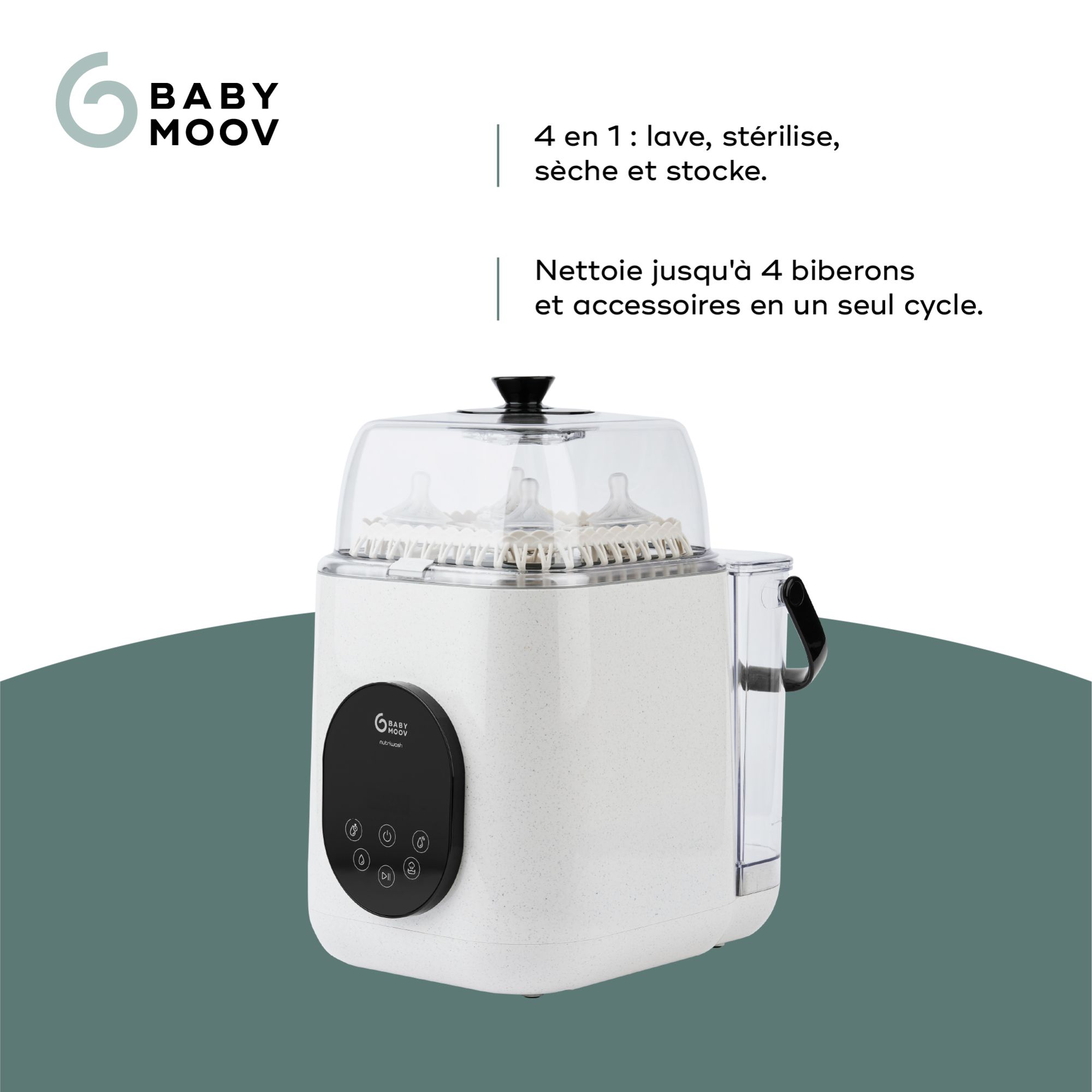 Le lave-biberon NutriWash de la marque Babymoov est l’allié indispensable des parents qui veulent un nettoyage rapide, complet et sans effort. Grâce à sa technologie 4-en-1, il lave, stérilise, sèche et stocke jusqu’à 4 biberons et leurs accessoires en un seul cycle. Ses 11 programmes, dont un mode express de 19 minutes, s’adaptent à tous les besoins du quotidien. Les 26 jets d’eau sous pression éliminent efficacement les résidus, tandis que la vapeur détruit 99,9% des bactéries. Son filtre HEPA assure un séchage sans germes et maintient la stérilisation jusqu’à 72 heures. Économique, il réduit jusqu’à 90% la consommation d’eau par rapport au lavage manuel et est livré avec 60 pastilles de lavage.