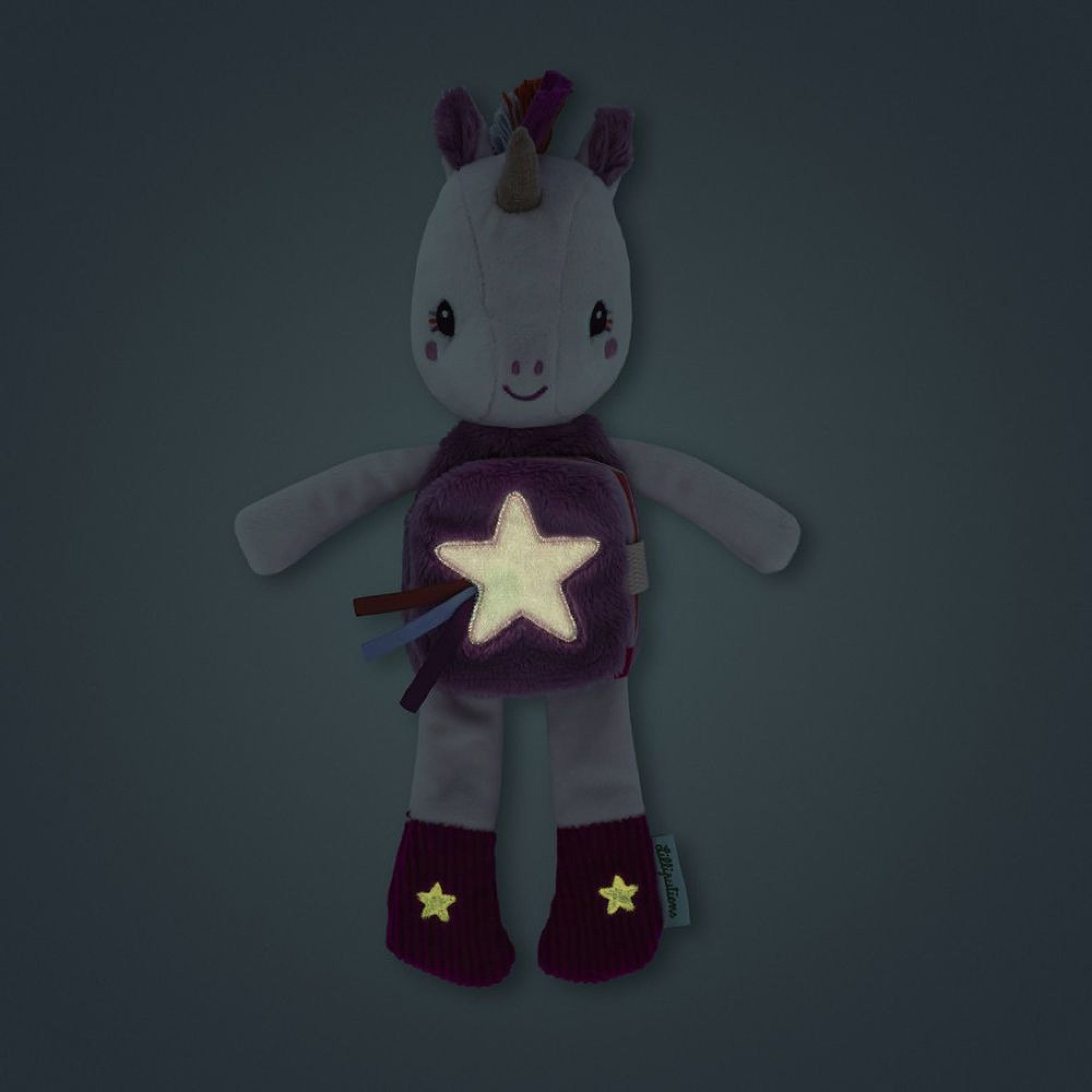 Un petit imagier est cousu sur le ventre de la peluche. Il présente tous les rituels avant d'aller dormir : se brosser les dents, mettre son pyjama ou faire bisou. Votre enfant va adorer observer cette peluche briller dans l'obscurité. Il ne pourra plus la perdre dans la nuit.