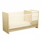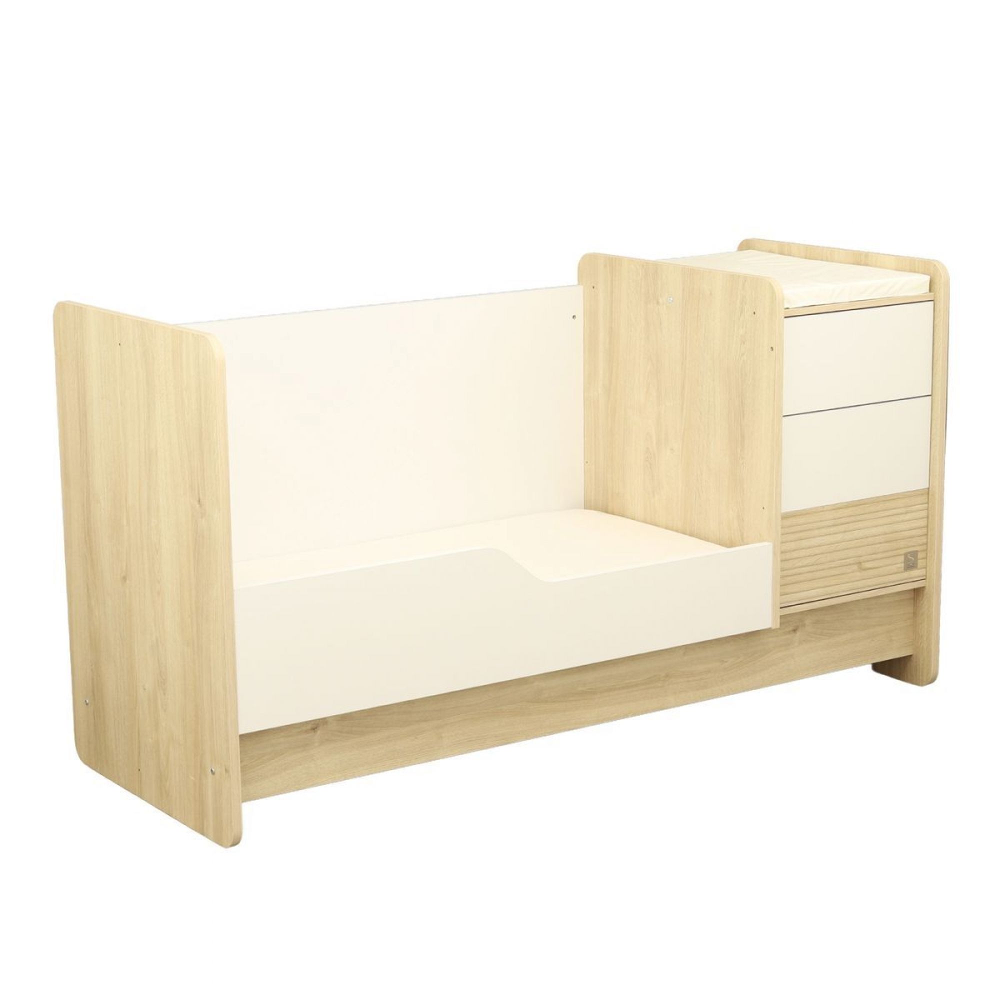 Ce lit c'est avant tout c’est l’association d’un décor bois tout doux : le Chêne Sépia, et de blanc pour un univers cocooning. Design et évolutif ! Dès la naissance, votre bébé profitera du confort d'un lit bébé 70x140 cm et vous, vous pourrez lui faire ses soins en toute sécurité sur le meuble à langer aux nombreux rangements qui lui est accolé. Plus tard, cet ensemble se transforme en lit enfant 90x190 cm (sommier vendu séparément), accompagné d'un bureau de grand !