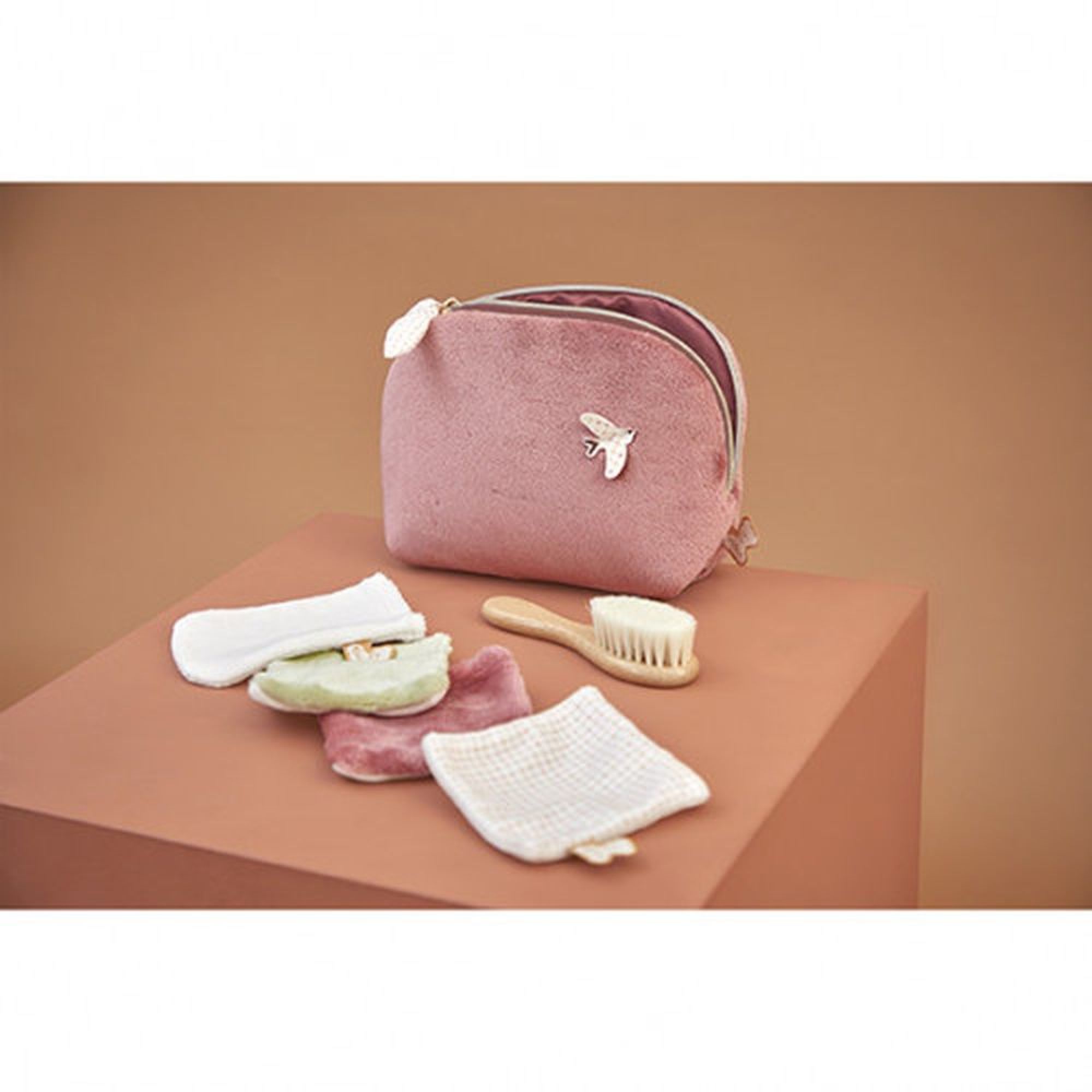 C'est une bonne idée de cadeau pour offrir à la maternité. La borsse est conçue avec des poils de chèvre pour coiffer les cheveux de votre bébé en douceur. La trousse est lavable en machine à 30°.
