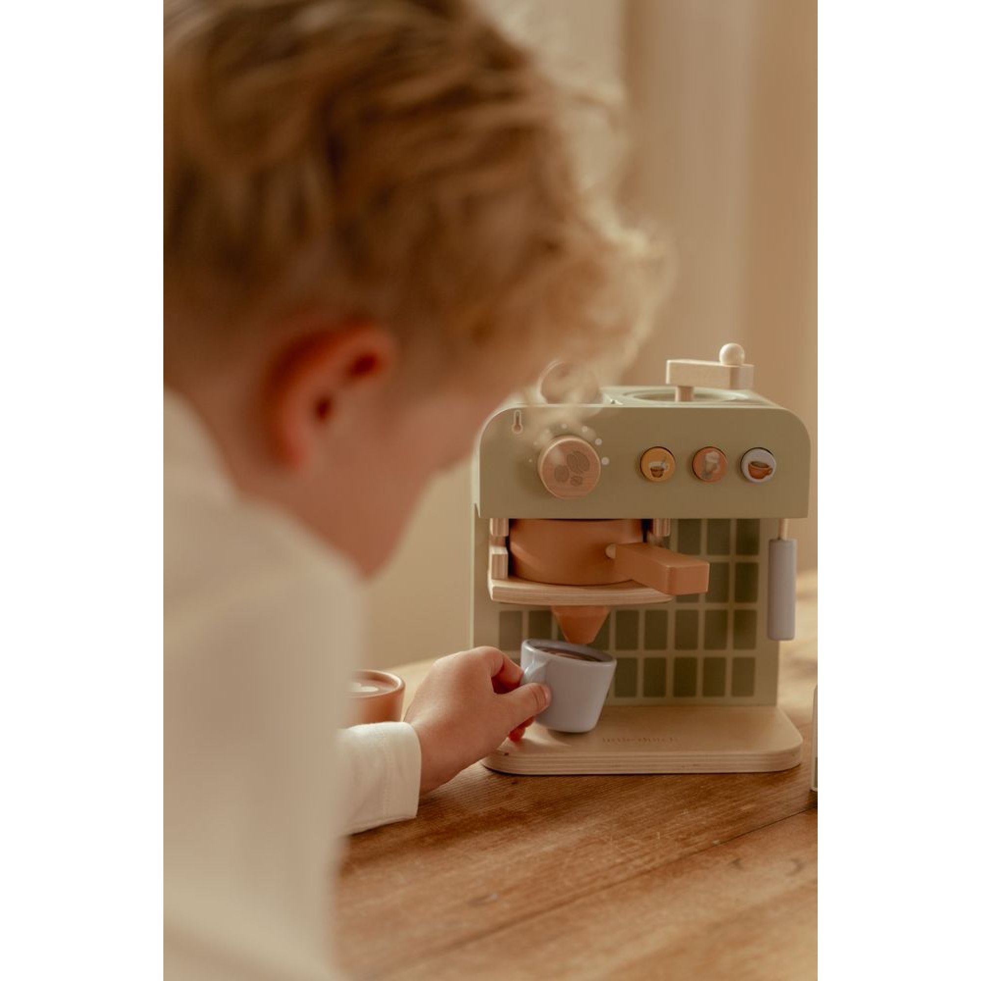 Découvrez la machine à café en bois FSC de la marque Little Dutch. C'est un jouet en bois classique et intemporel, conçu pour stimuler le jeu de rôle et la motricité des enfants. Il incarne parfaitement l'esthétique douce et colorée de la marque.