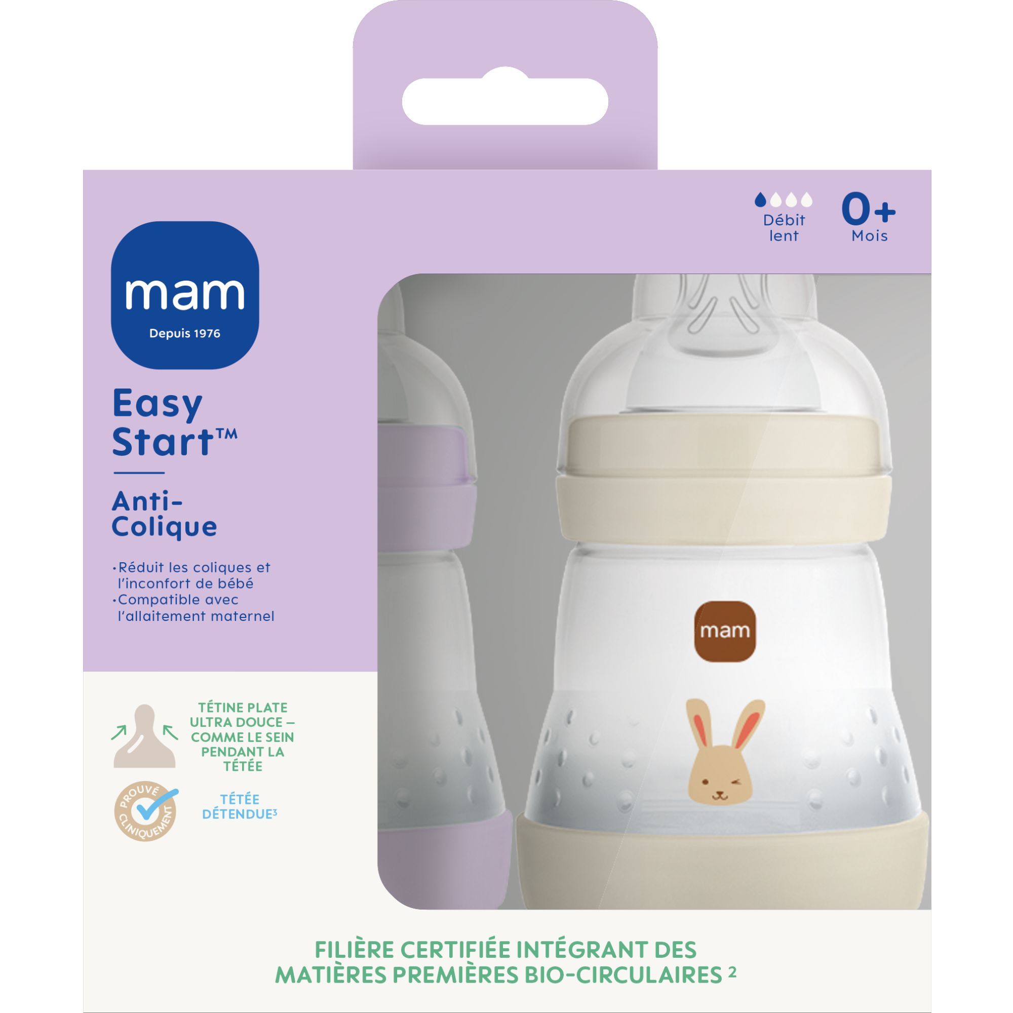 Les biberons Mam vont faciliter le passage du sein au biberon si vous allaitez grâce à sa forme plate qui reproduit celle du sein. Le corps, la base dévissable, la bague et le capuchon sont fabriqués à partir de matériaux provenant d'une filière certifiée intégrant des matières premières bio-circulaires.