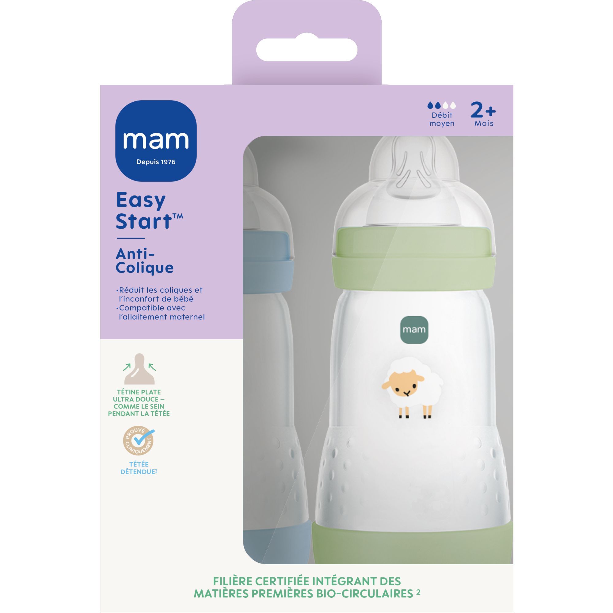 Les biberons Mam vont faciliter le passage du sein au biberon si vous allaitez grâce à sa forme plate qui reproduit celle du sein. Le corps, la base dévissable, la bague et le capuchon sont fabriqués à partir de matériaux provenant d'une filière certifiée intégrant des matières premières bio-circulaires.