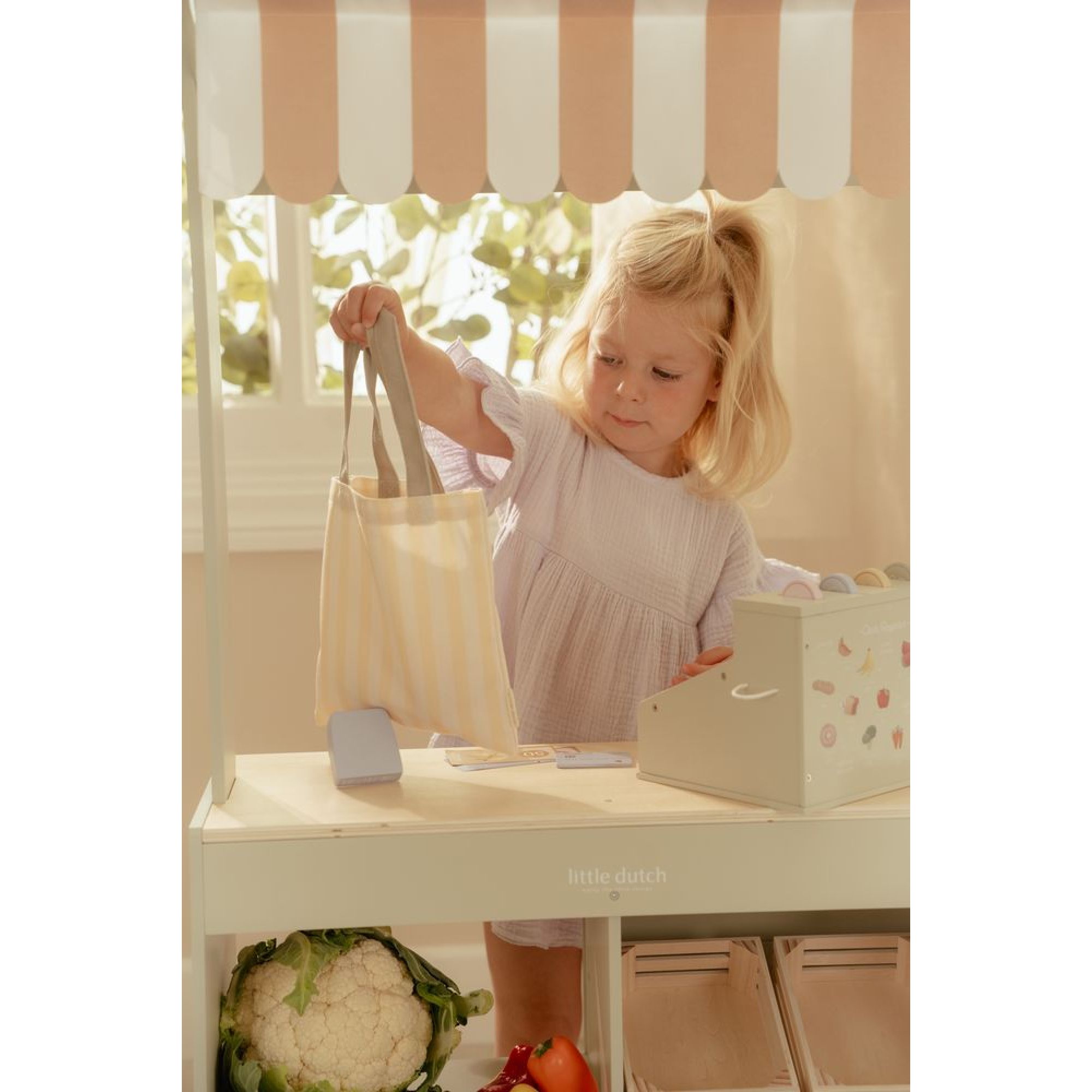 Découvrez la marchande en bois FSC de la marque Little Dutch. C'est un jouet en bois classique et intemporel, conçu pour stimuler le jeu de rôle et la motricité des enfants. Il incarne parfaitement l'esthétique douce et colorée de la marque.