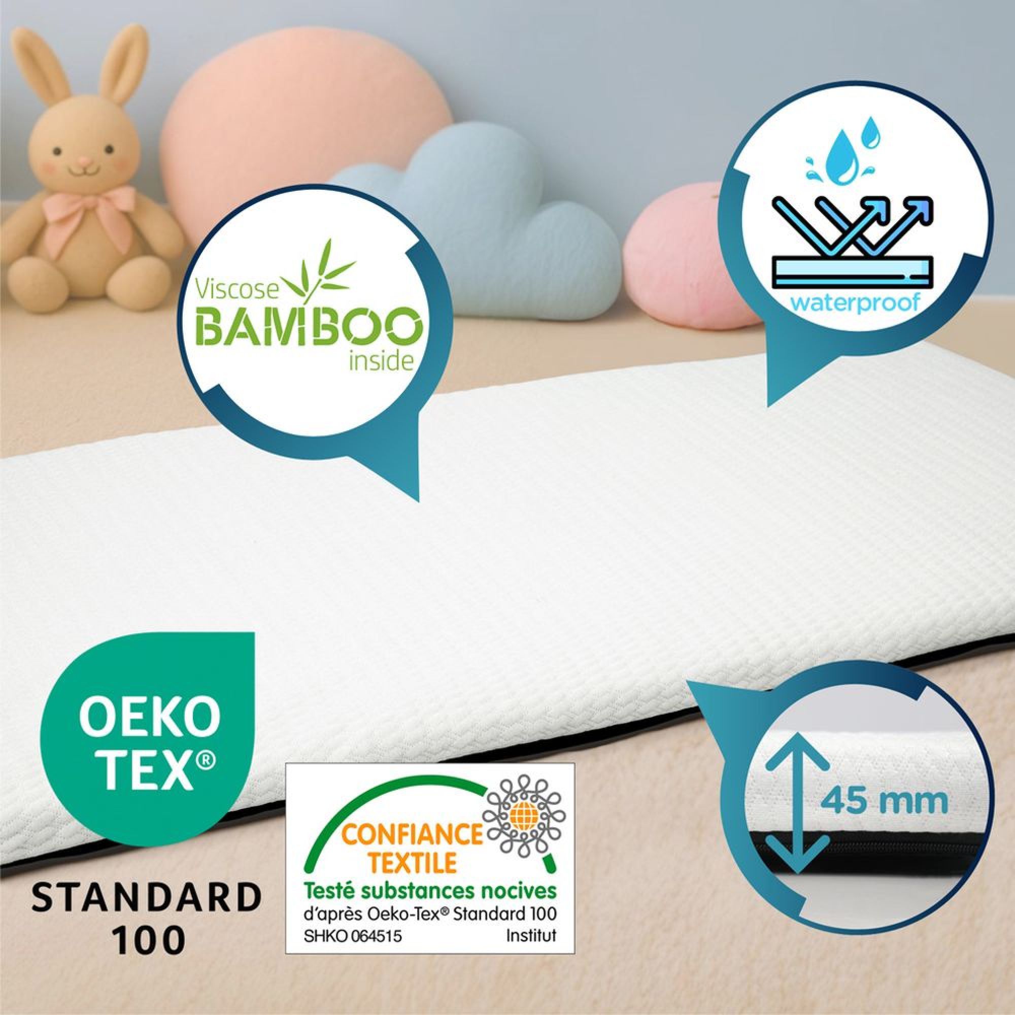 Pour une hygiène irréprochable, la housse du matelas se retire facilement grâce à un système de zip. La housse peut être nettoyée en cycle délicat, ce qui est indispensable pour gérer les petits accidents du quotidien (régurgitations, fuites). Conçu pour favoriser la circulation de l'air, il limite la transpiration excessive du nourrisson pendant son sommeil.