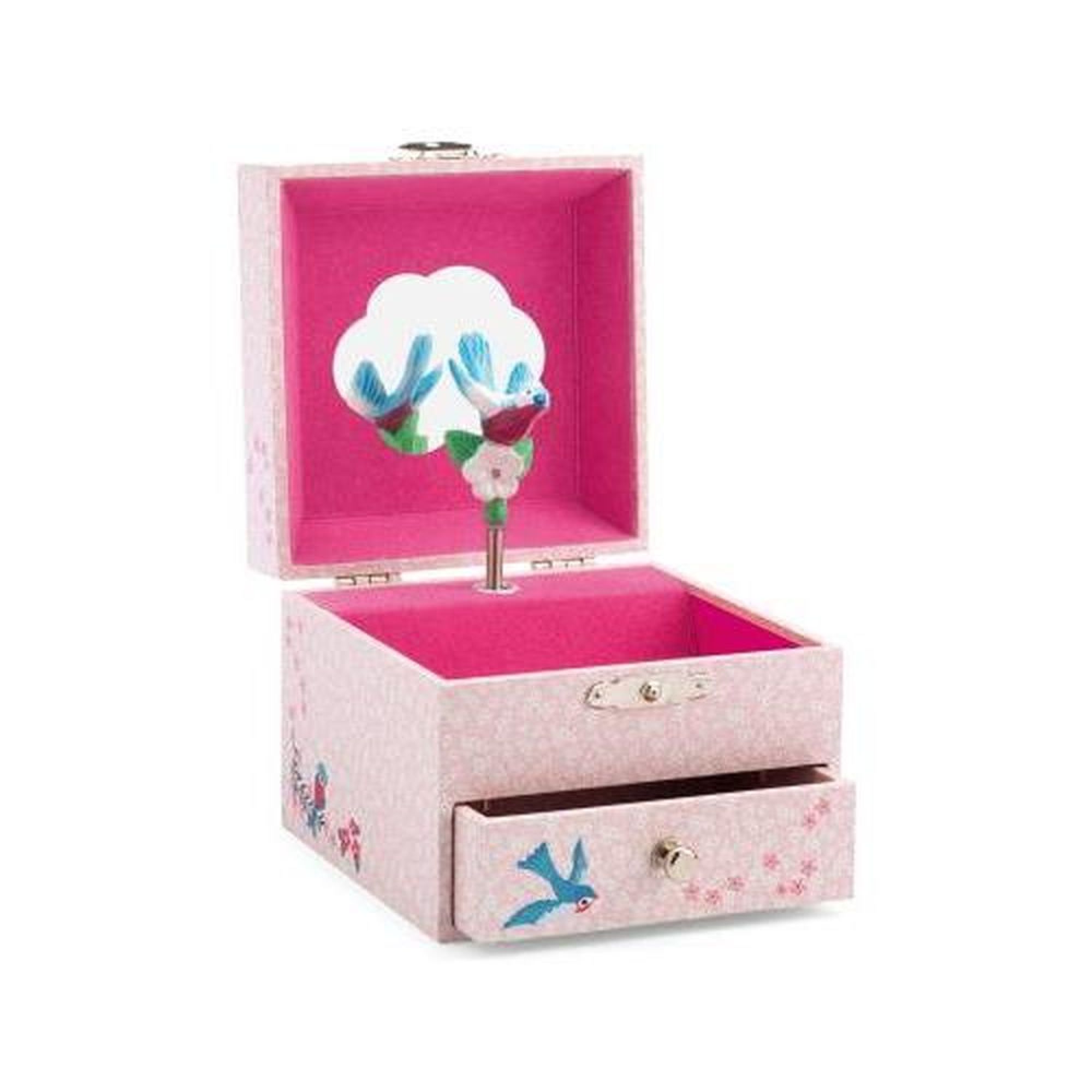 Jolie boîte à musique en forme de cube finement décorée où se trouve à l'intérieur un oiseau pinson. Un tiroir est intégré à la boîte à musique pour permettre à votre enfant d'y ranger ses secrets ou ses bijoux.