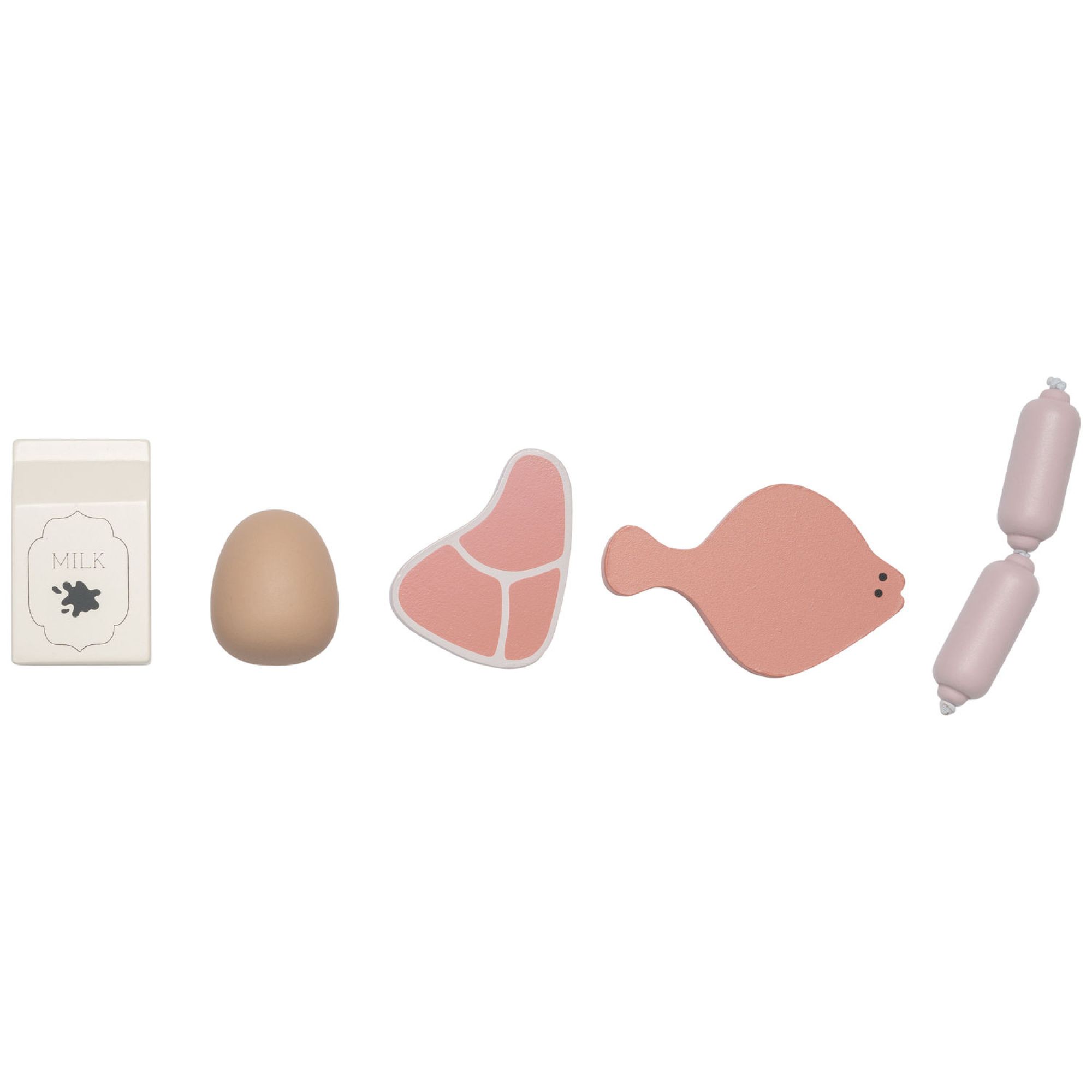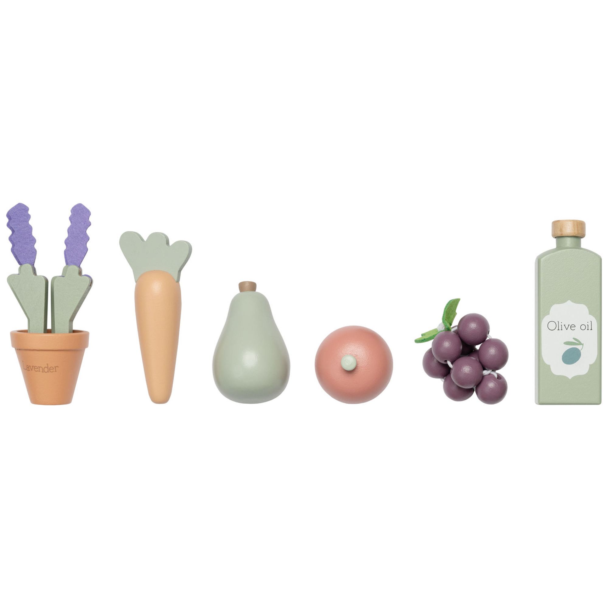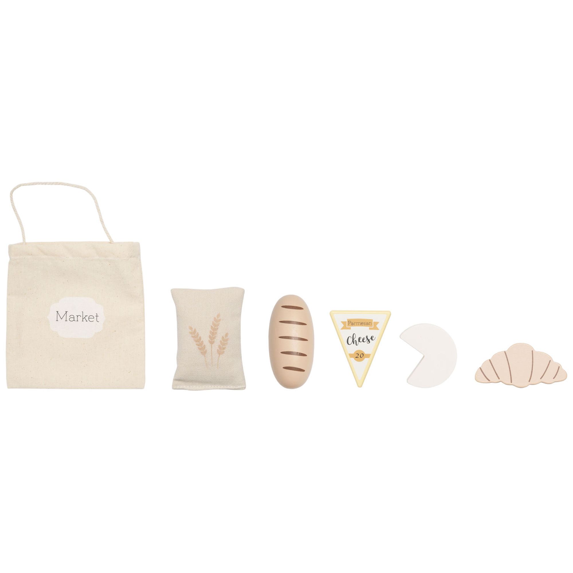 Inclus : 1 sac en tissu, 1 pot de lavande, 1 pain, 1 brique de lait, 1 bouteille d’huile d’olive, 1 fromage, 1 carotte, 1 oignon, 1 tomate, 1 sac de farine, 1 œuf, 1 poire, 1 raisin, 1 saucisse, 1 viande, 1 poisson, 1 fromage de brie, 1 croissant